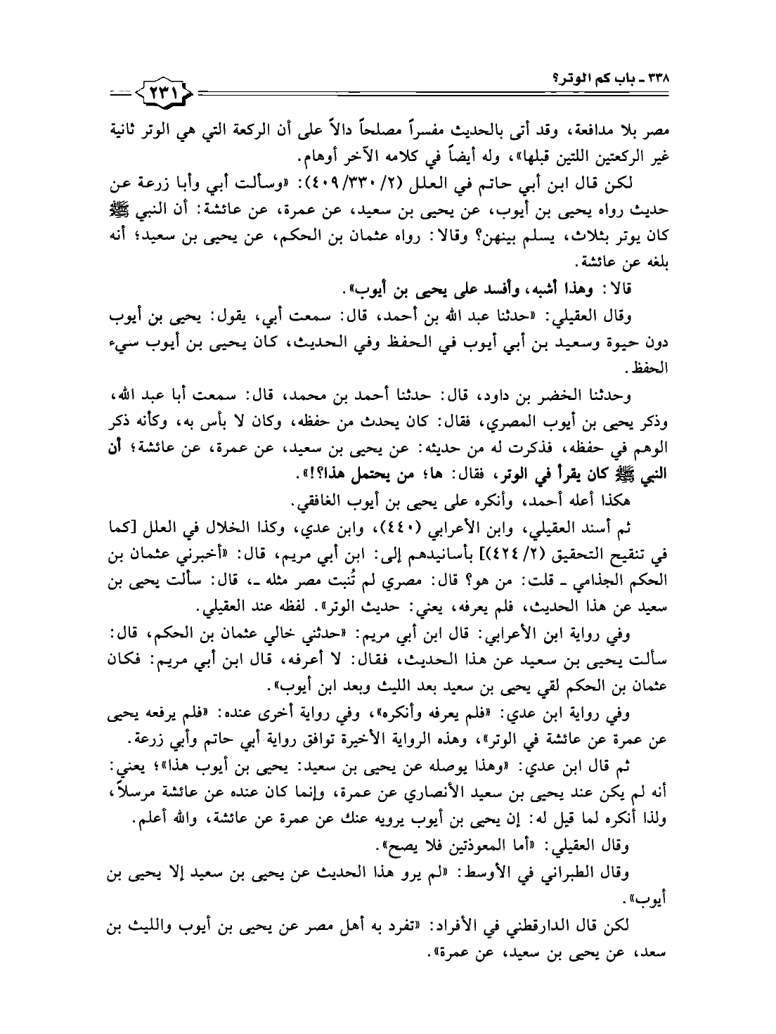 لكن قال ابن أبي حاتم في العلل (٢/ ٣٣٠/ ٤٠٩): "وسألت أبي وأبا زرعة عن حديث رواه يحيى بن أيوب، عن يحيى بن سعيد، عن عمرة، عن عائشة: أن النبي - صلى الله عليه وسلم - كان يوتر بثلاث، يسلم بينهن؟ وقالا: رواه عثمان بن الحكم، عن يحيى بن سعيد؛ أنه بلغه عن عائشة.