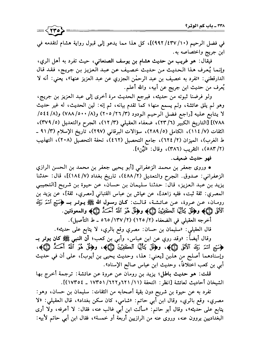 • وروى جعفر بن محمد الزعفراني [أبو يحيى جعفر بن محمد بن الحسن الرازي الزعفراني: صدوق. الجرح والتعديل (٢/ ٤٨٨)، تاريخ بغداد (٧/ ١٨٤)]، قال: حدثنا يزيد بن عبد العزيز، قال: حدثنا سليمان بن حسان، عن حيوة بن شريح [التجيبي المصري: ثقة ثبت، فقيه زاهد]، عن عياش بن عباس القتباني [مصري، ثقة]، عن يزيد بن رومان، عن عروة، عن عائشة، قالت: كان رسول الله - صلى الله عليه وسلم - يوتر بـ {سَبِّحِ اسْمَ رَبِّكَ الْأَعْلَى (١)} و {قُلْ يَاأَيُّهَا الْكَافِرُونَ (١)} و {قُلْ هُوَ اللَّهُ أَحَدٌ (١)} والمعوذتين.