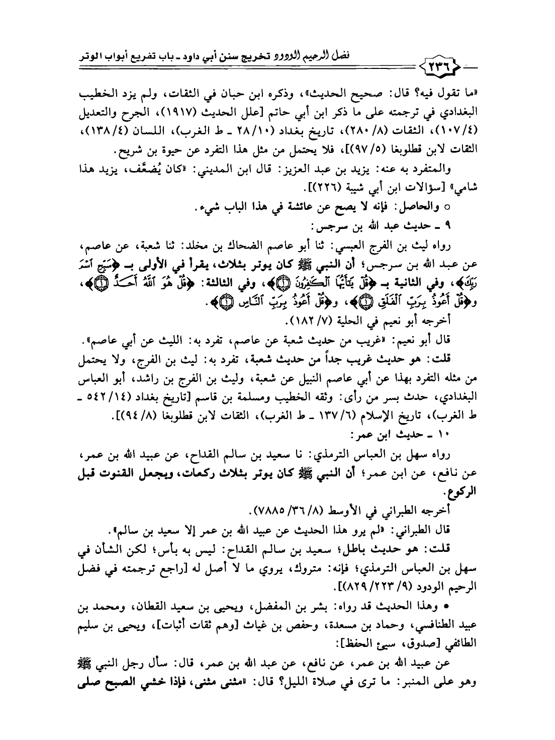 رواه ليث بن الفرج العبسي: ثنا أبو عاصم الضحاك بن مخلد: ثنا شعبة، عن عاصم، عن عبد الله بن سرجس؛ أن النبي - صلى الله عليه وسلم - كان يوتر بثلاث، يقرأ في الأولى بـ {سَبِّحِ اسْمَ رَبِّكَ}، وفي الثانية بـ {قُلْ يَاأَيُّهَا الْكَافِرُونَ (١)}، وفي الثالثة: {قُلْ هُوَ اللَّهُ أَحَدٌ (١)}، و {قُلْ أَعُوذُ بِرَبِّ الْفَلَقِ (١)}، و {قُلْ أَعُوذُ بِرَبِّ النَّاسِ (١)}.