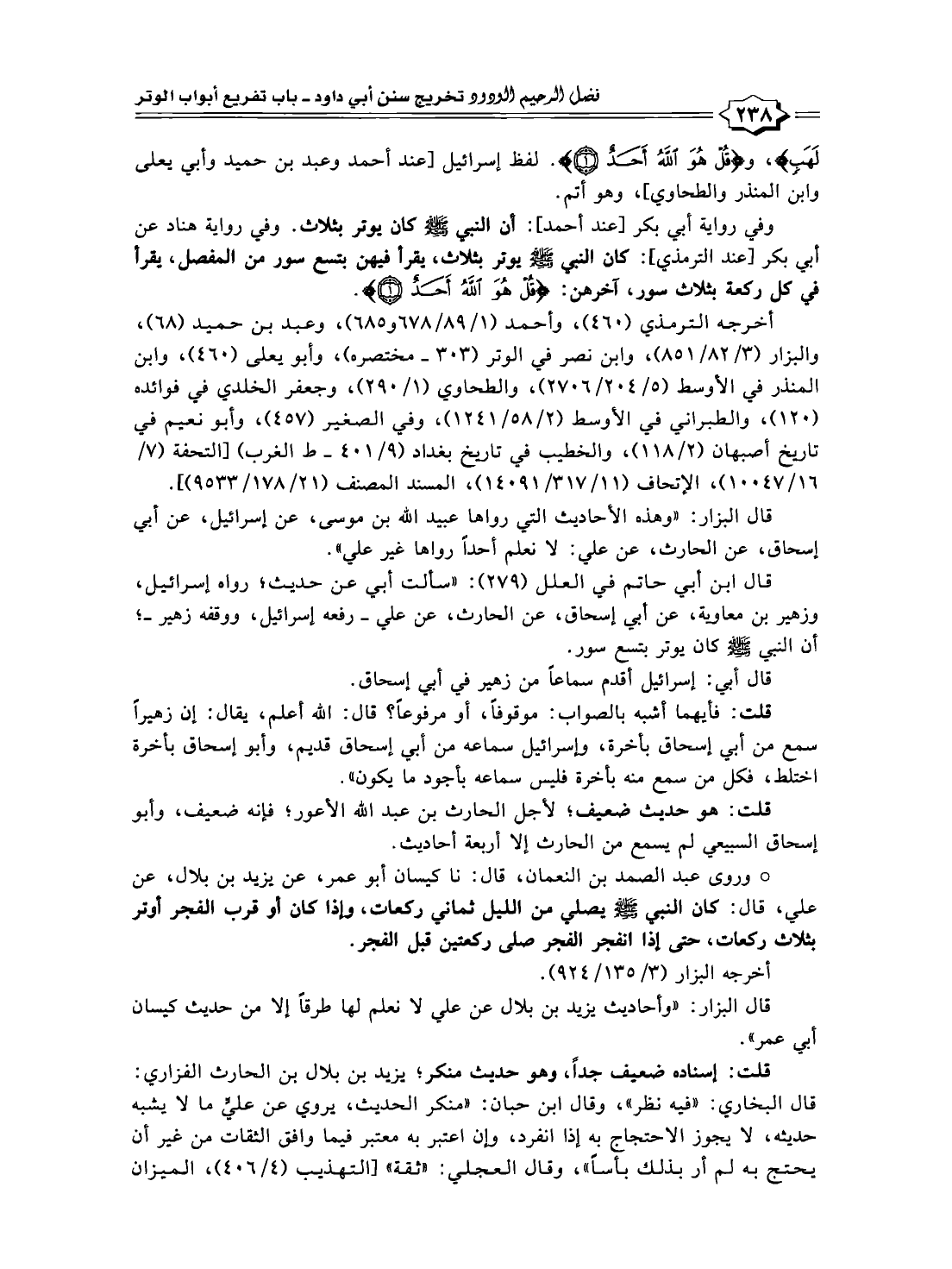 قال ابن أبي حاتم في العلل (٢٧٩): "سألت أبي عن حديث؛ رواه إسرائيل، وزهير بن معاوية، عن أبي إسحاق، عن الحارث، عن علي -رفعه إسرائيل، ووقفه زهير-؛ أن النبي -صلى الله عليه وسلم- كان يوتر بتسع سور.