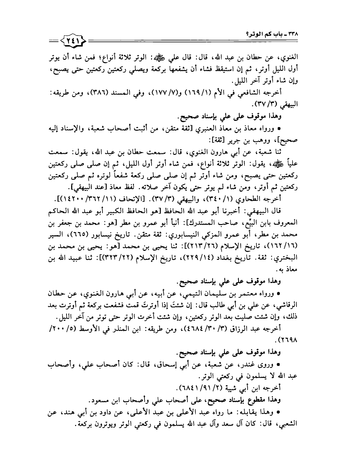 • ورواه معتمر بن سليمان التيمي، عن أبيه، عن أبي هارون الغنوي، عن حطان الرقاشي، عن علي بن أبي طالب قال: إن شئتَ إذا أوترتَ قمت فشفعت بركعة ثم أوترت بعد ذلك، وإن شئت صليت بعد الوتر ركعتين، وإن شئت أخرت الوتر حتى توتر من آخر الليل.