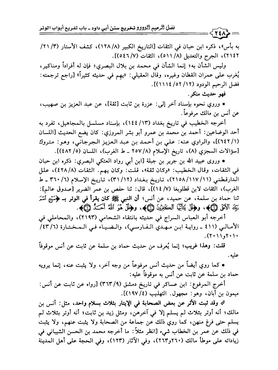 • وروى عبيد الله بن جرير بن جبلة [ابن أبي رواد العتكي البصري: ذكره ابن حبان في الثقات، وقال الخطيب: "وكان ثقة"، قلت: وكان يهم. الثقات (١٤٢٨/ ٨، علل الدارقطني (١١/ ١١٧/ ٢١٥٨)، تاريخ بغداد (١٢/ ٣١)، تاريخ الإسلام (٦/ ٣٦٠ - ط الغرب)، الثقات لابن قطلوبغا (٧/ ١٤)]؛ قال: ثنا حفص بن عمر الضرير [صدوق عالم]: ثنا حماد بن سلمة، عن حميد، عن أنس؛ أن النبي -صلى الله عليه وسلم- كان يقرأ في الوتر بـ {سَبِّحِ اسْمَ رَبِّكَ الْأَعْلَى (١)} و {قُلْ يَاأَيُّهَا الْكَافِرُونَ (١)}، و {قُلْ هُوَ اللَّهُ أَحَدٌ (١)}.