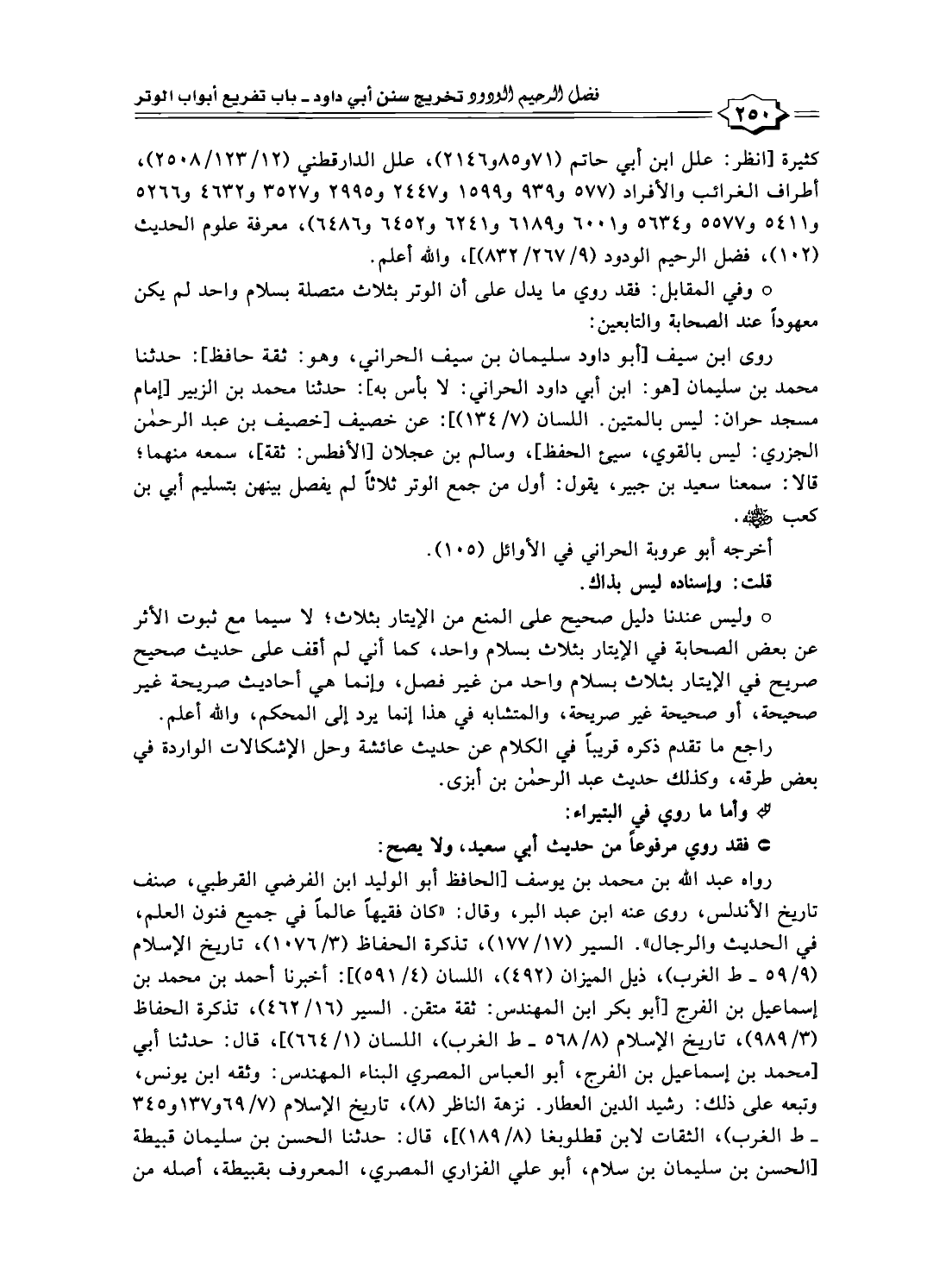 روى ابن سيف [أبو داود سليمان بن سيف الحراني، وهو: ثقة حافظ]: حدثنا محمد بن سليمان [هو: ابن أبي داود الحراني: لا بأس به]: حدثنا محمد بن الزبير [إمام مسجد حران: ليس بالمتين. اللسان (٧/ ١٣٤)]: عن خصيف [خصيف بن عبد الرحمن الجزري: ليس بالقوي، سيئ الحفظ]؛ وسالم بن عجلان [الأفطس: ثقة]؛ سمعه منهما؛ قالا: سمعنا سعيد بن جبير، يقول: أول من جمع الوتر ثلاثًا لم يفصل بينهن بتسليم أبي بن كعب -رضي الله عنه-.