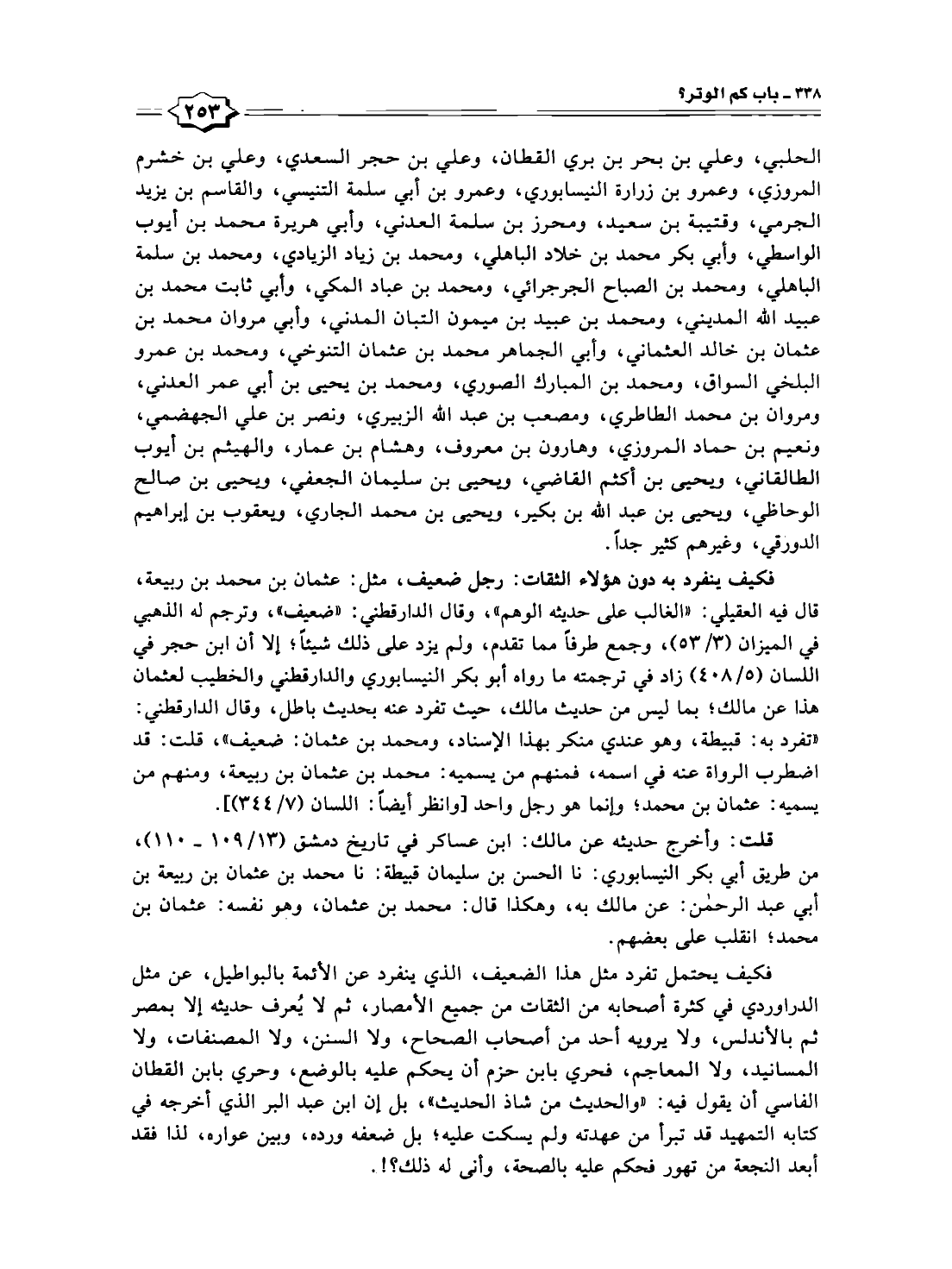 فكيف ينفرد به دون هؤلاء الثقات: رجل ضعيف، مثل: عثمان بن محمد بن ربيعة، قال فيه العقيلي: "الغالب على حديثه الوهم"، وقال الدارقطني: "ضعيف"، وترجم له الذهبي في الميزان (٣/ ٥٣)، وجمع طرفاً مما تقدم، ولم يزد على ذلك شيئًا؛ إلا أن ابن حجر في اللسان (٥/ ٤٠٨) زاد في ترجمته ما رواه أبو بكو النيسابوري والدارقطني والخطيب لعثمان هذا عن مالك؛ بما ليس من حديث مالك، حيث تفرد عنه بحديث باطل، وقال الدارقطني: "تفرد به: قبيطة، وهو عندي منكلر بهذا الإسناد، ومحمد بن عثمان: ضعيف"، قلت: قد اضطرب الرواة عنه في اسمه، فمنهم من يسميه: محمد بن عثمان بن ربيعة، ومنهم من يسميه: عثمان بن محمد؛ وإنما هو رجل واحد [وانظر أيضًا: اللسان (٧/ ٣٤٤)].