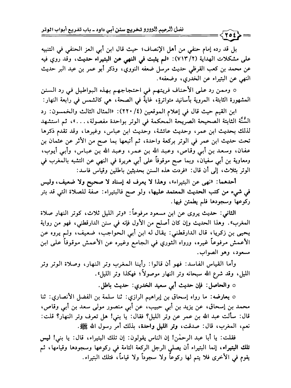* وممن رد على الأحناف فريتهم في احتجاجهم بهذه البواطيل في رد السنن المشهورة الثابتة، المروية بأسانيد متواترةٍ، غايةً في الصحة، هي كالشمس في رابعة النهار: ابن القيم حيث قال في إعلام الموقعين (٤/ ٢٢٠): "المثال الثالث والخمسون: رد السُّنَّة الثابتة الصحيحة الصريحة المحكمة في الوتر بواحدة مفصولة، ... "، ثم استشهد لذلك بحديث ابن عمر، وحديث عائشة، وحديث ابن عباس، وغيرها، وقد تقدم ذكرها تحت حديث ابن عمر في الوتر بركعة واحدة، ثم أتبعها بما صح من الأثر عن عثمان بن عفان، وسعد بن أبي وقاص، وعبد الله بن عمر، وعبد الله بن عباس، وأبي أيوب، ومعاوية بن أبي سفيان، وبما صح موقوفًا على أبي هريرة في النهي عن التشبه بالمغرب في الوتر بثلاث، إلى أن قال: "فردت هذه السنن بحديثين باطلين وقياس فاسد: