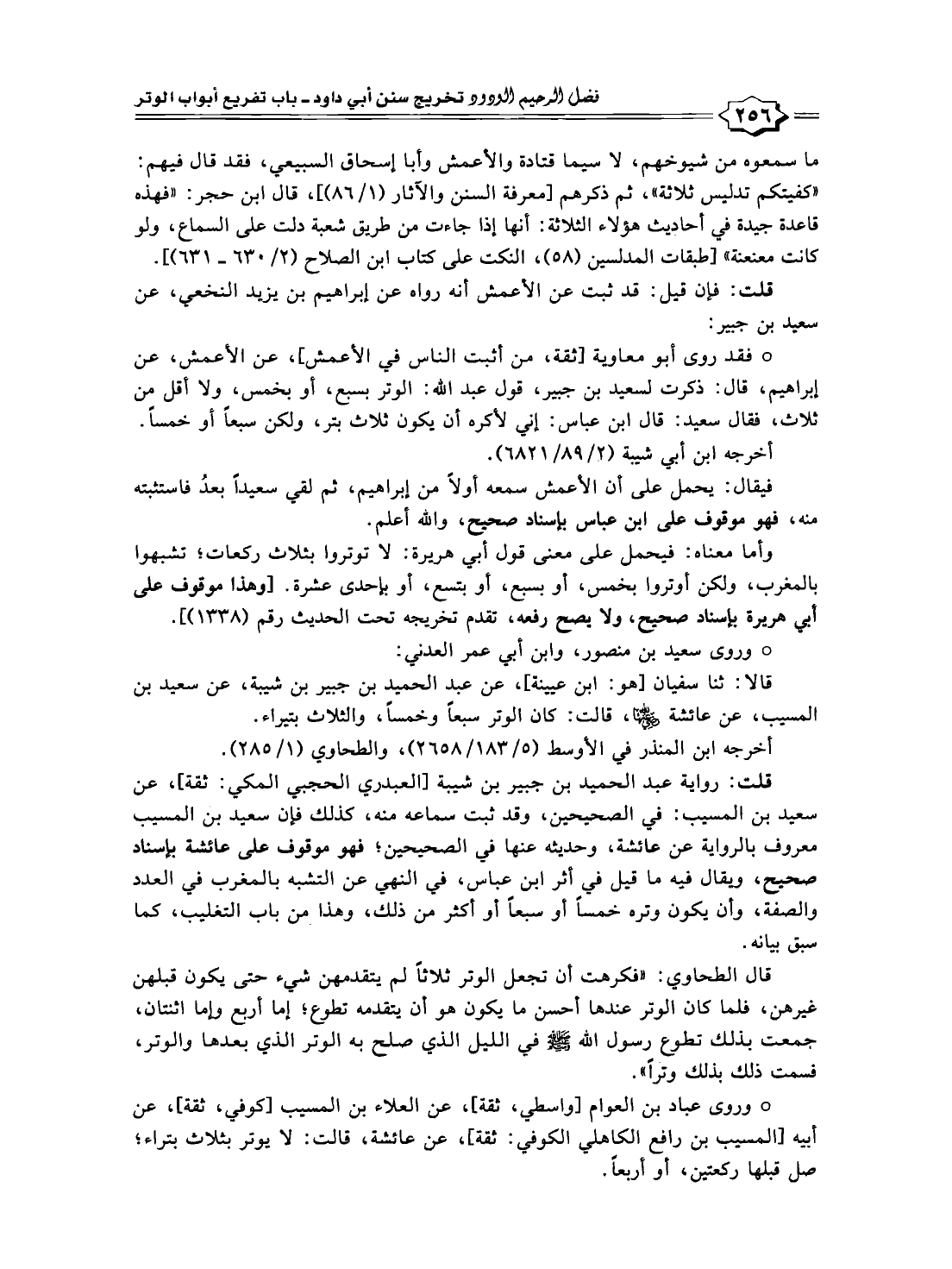قلت: رواية عبد الحميد بن جبير بن شيبة [العبدري الحجبي المكي: ثقة]، عن سعيد بن المسيب: في الصحيحين، وقد ثبت سماعه منه، كذلك فإن سعيد بن المسيب معروف بالرواية عن عائشة، وحديثه عنها في الصحيحين، فهو موقوف على عائشة بإسناد صحيح، ويقال فيه ما قيل في أثر ابن عباس، في النهي عن التشبه بالمغرب في العدد والصفة، وأن يكون وتره خمسًا أو سبعاً أو أكثر من ذلك، وهذا من باب التغليب، كما سبق بيانه.