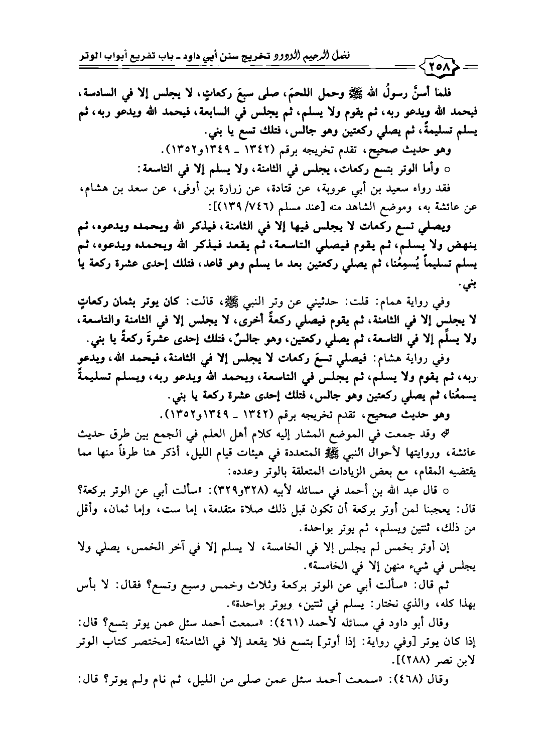وقال أبو داود في مسائله لأحمد (٤٦١): "سمعت أحمد سئل عمن يوتر بتسع؟ قال: إذا كان يوتر [وفي رواية: إذا أوتر] بتسع فلا يقعد إلا في الثامنة" أمختصر كتاب الوتر لابن نصر (٢٨٨)].