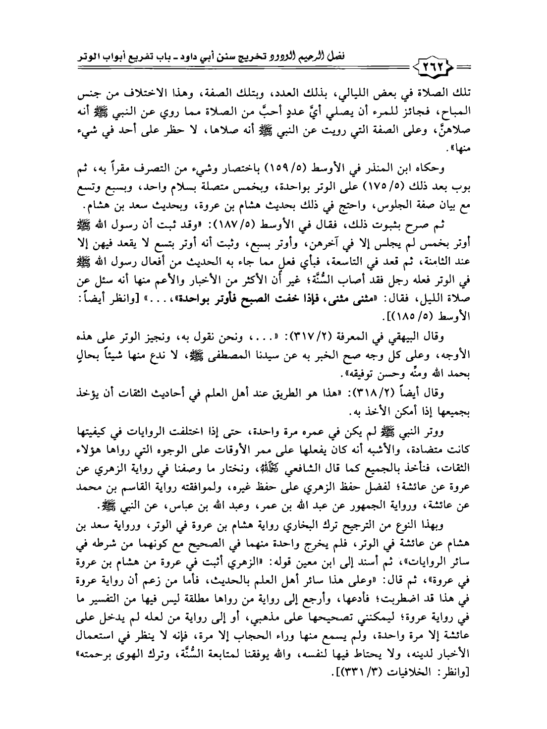 وحكاه ابن المنذر في الأوسط (٥/ ١٥٩) باختصار وشيء من التصرف مقراً به، ثم بوب بعد ذلك (٥/ ١٧٥) على الوتر بواحدة، وبخمس متصلة بسلام واحد، وبسبع وتسع مع بيان صفة الجلوس، واحتج في ذلك بحديث هشام بن عروة، وبحديث سعد بن هشام.