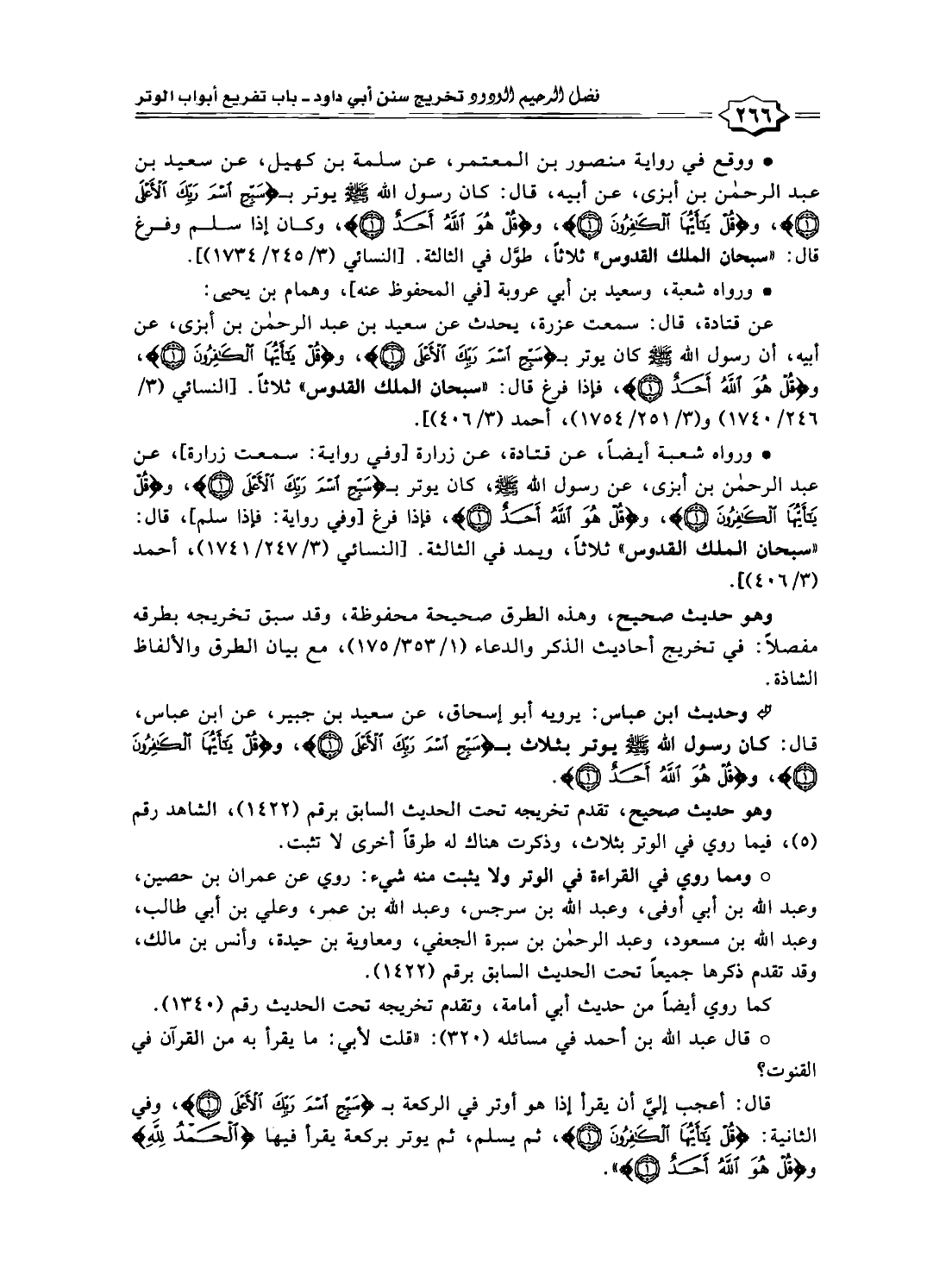 عن قتادة، قال: سمعت عزرة، يحدث عن سعيد بن عبد الرحمن بن أبزى، عن أبيه، أن رسول الله -صلى الله عليه وسلم- كان يوتر بـ {سَبِّحِ اسْمَ رَبِّكَ الْأَعْلَى (١)}، و {قُلْ يَاأَيُّهَا الْكَافِرُونَ (١)} و {قُلْ هُوَ اللَّهُ أَحَدٌ (١)}، فإذا فرغ قال:"سبحان الملك القدوس" ثلاثًا. [النسائي (٣/ ٢٤٦/ ١٧٤٠) و (٣/ ٢٥١/ ١٧٥٤)، أحمد (٣/ ٤٠٦)].