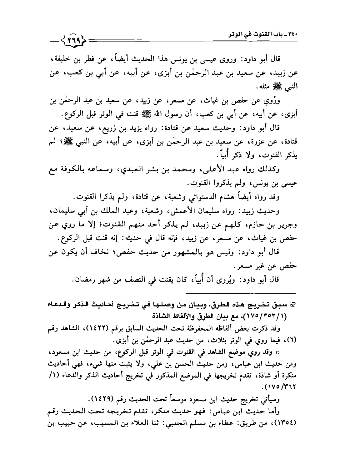 قال أبو داود: وحديث سعيد عن قتادة: رواه يزيد بن زريع، عن سعيد، عن قتادة، عن عزرة، عن سعيد بن عبد الرحمن بن أبزى، عن أبيه، عن النبي -صلى الله عليه وسلم-؛ لم يذكر القنوت، ولا ذكر أُبياً.
