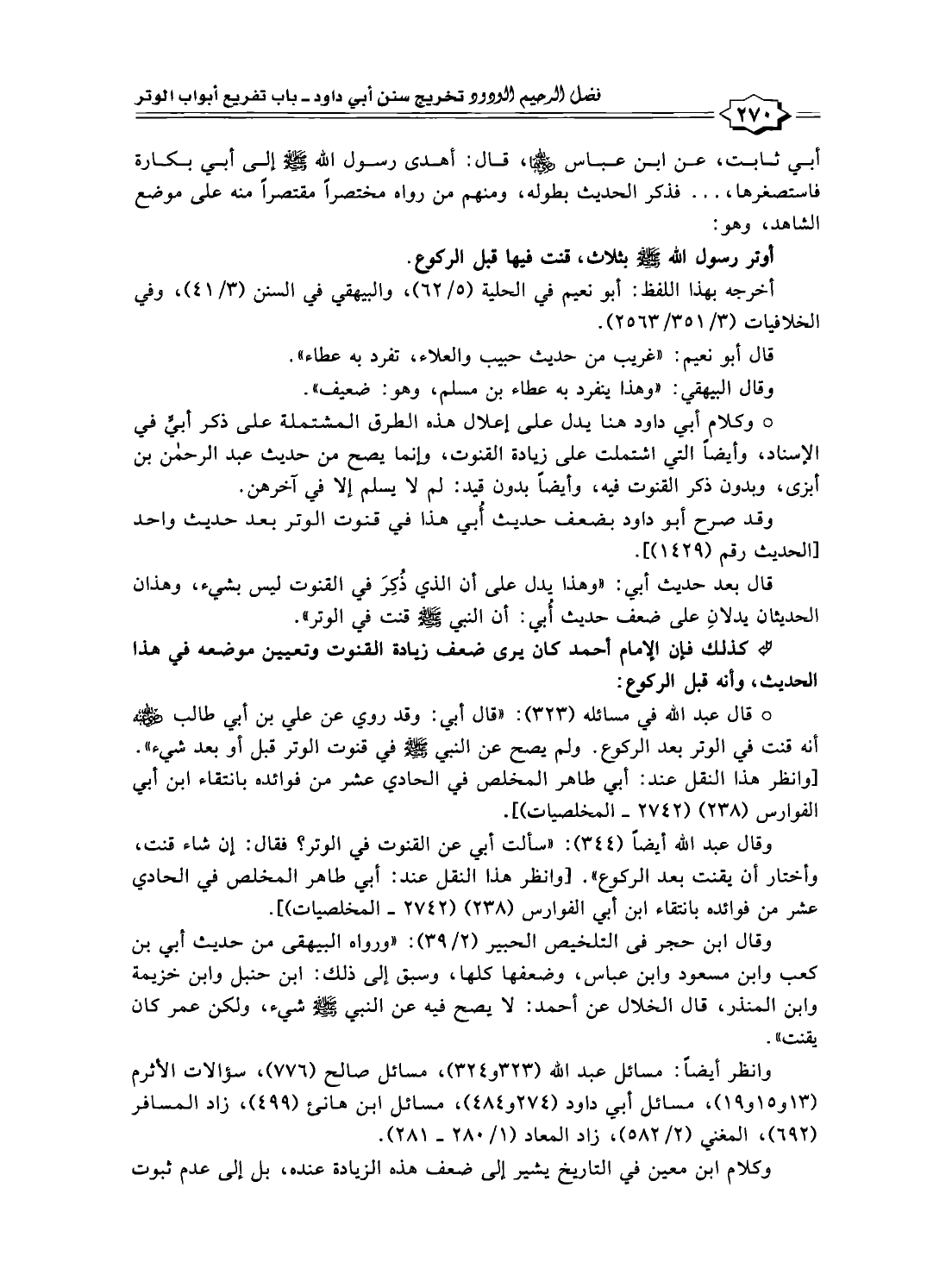 * وكلام أبي داود هنا يدل على إعلال هذه الطرق المشتملة على ذكر أبىِّ في الإسناد، وأيضاً التي اشتملت على زيادة القنوت، وإنما يصح من حديث عبد الرحمن بن أبزى، وبدون ذكر القنوت فيه، وأيضًا بدون قيد: لم لا يسلم إلا في آخرهن.