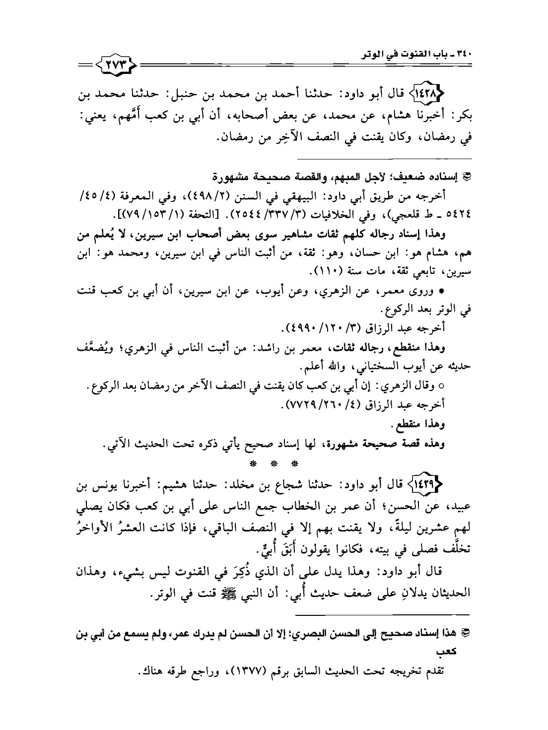 ١٤٢٨ - قال أبو داود: حدثنا أحمد بن محمد بن حنبل: حدثنا محمد بن بكر: أخبرنا هشام، عن محمد، عن بعض أصحابه، أن أبي بن كعب أَمَّهم، يعني: في رمضان، وكان يقنت في النصف الآخِر من رمضان.