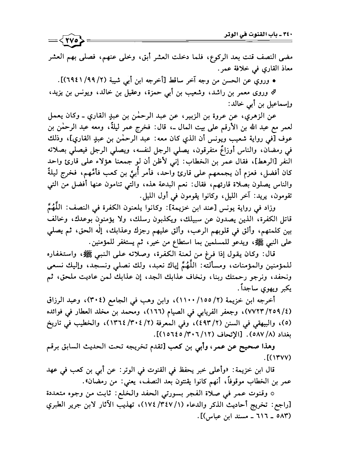 قال ابن خزيمة: "وأعلى خبر يحفظ في القنوت في الوتر: عن أبي بن كعب في عهد عمر بن الخطاب موقوفًا، أنهم كانوا يقنتون بعد النصف، يعني: من رمضان".