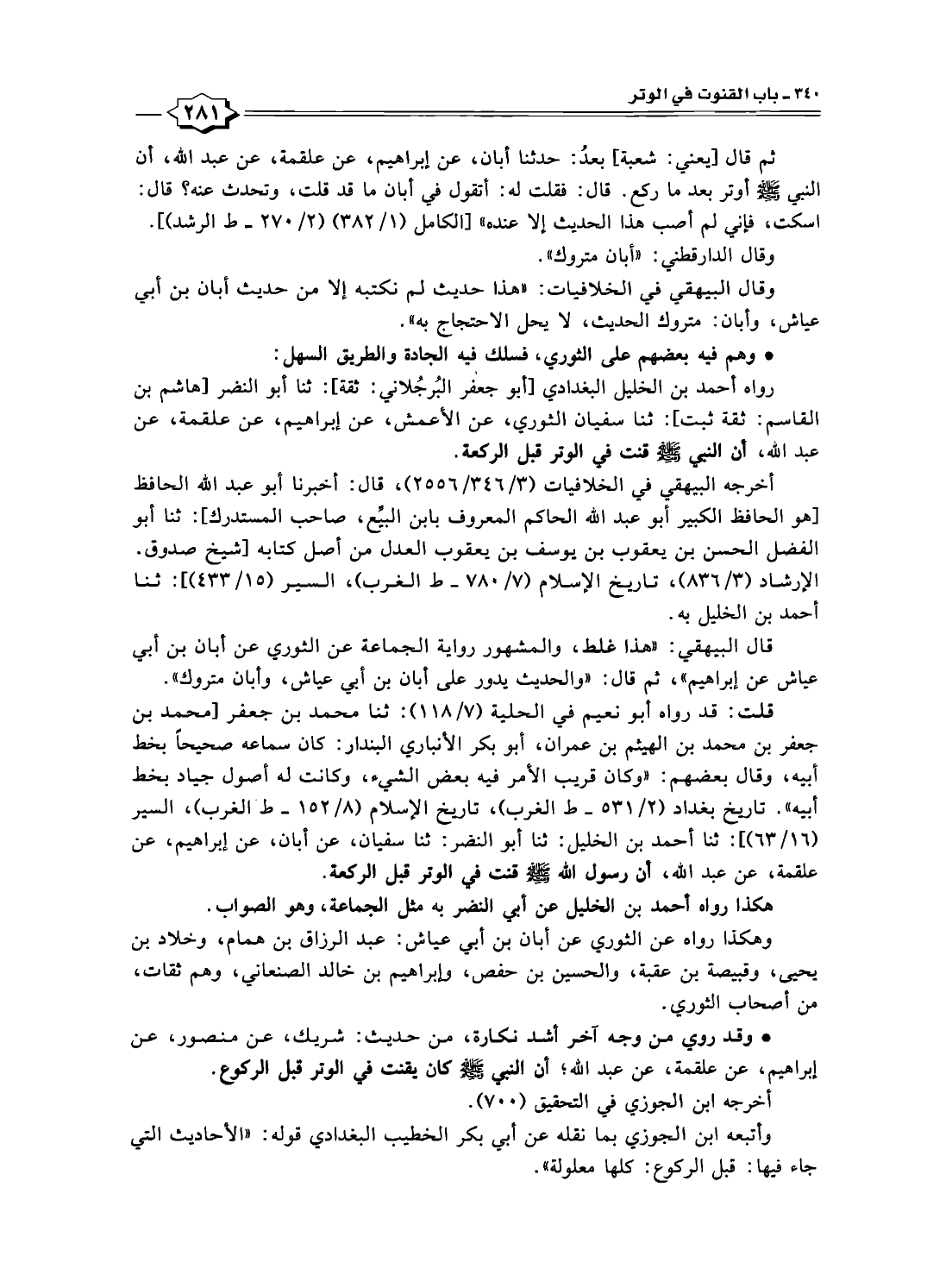 رواه أحمد بن الخليل البغدادي [أبو جعفر البُرجُلاني: ثقة]: ثنا أبو النضر [هاشم بن القاسم: ثقة ثبت]: ثنا سفيان الثوري، عن الأعمش، عن إبراهيم، عن علقمة، عن عبد الله، أن النبى -صلى الله عليه وسلم- قنت في الوتر قبل الركعة.