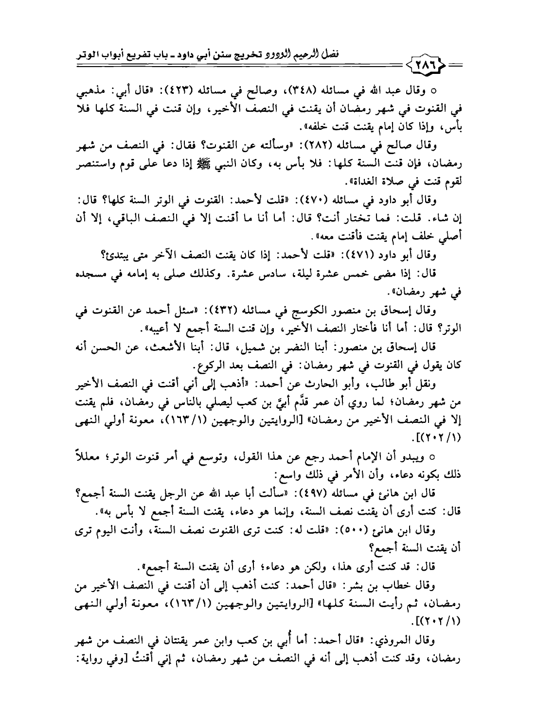 وقال أبو داود في مسائله (٤٧٠): "قلت لأحمد: القنوت في الوتر السنة كلها؟ قال: إن شاء. قلت: فما تختار أنت؟ قال: أما أنا ما أقنت إلا في النصف الباقي، إلا أن أصلي خلف إمام يقنت فأقنت معه".