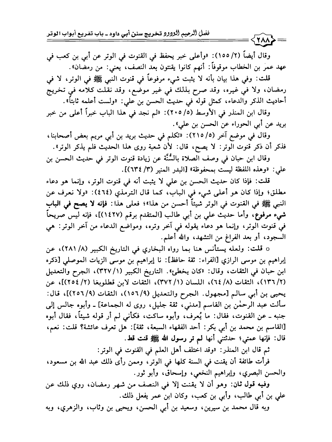 قلت: وفي هذا بيان بأنه لا يثبت شيء مرفوعًا في قنوت النبي -صلى الله عليه وسلم- في الوتر، لا في رمضان، ولا في غيره، وقد صرح بذلك في غير موضع، وقد نقلت كلامه في تخريج أحاديث الذكر والدعاء، كمثل قوله في حديث الحسن بن علي: "ولست أعلمه ثابتًا".