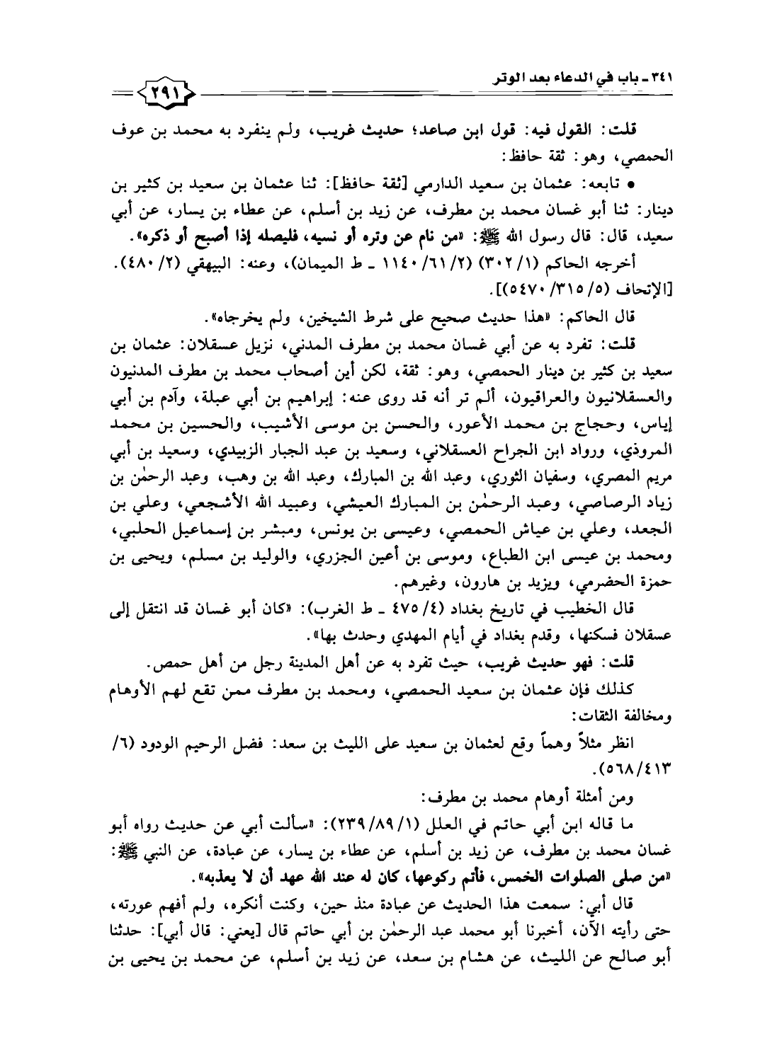 تابعه: عثمان بن سعيد الدارمي [ثقة حافظ]: ثنا عثمان بن سعيد بن كثير بن دينار: ثنا أبو غسان محمد بن مطرف، عن زيد بن أسلم، عن عطاء بن يسار، عن أبي سعيد، قال: قال رسول الله -صلى الله عليه وسلم-: "من نام عن وتره أو نسيه، فليصله إذا أصبح أو ذكره".