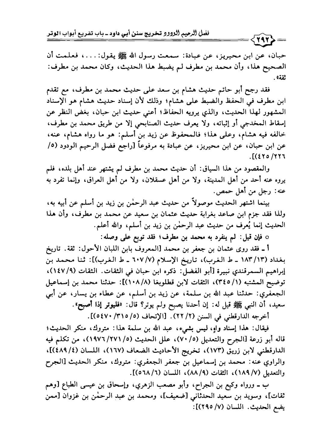 فقد رجح أبو حاتم حديث هشام بن سعد على حديث محمد بن مطرف، مع تقدم ابن مطرف في الحفظ والضبط على هشام؛ وذلك لأن إسناد حديث هشام هو الإسناد المشهور لهذا الحديث، والذي يرويه الحفاظ؛ أعني حديث ابن حبان، بغض النظر عن إسقاط المخدجي أو إثباته، ولا يعرف حديث الصنابحي إلا من طريق محمد بن مطرف، خالفه فيه هشام، وعلى هذا؛ فالمحفوظ عن زيد بن أسلم: هو ما رواه هشام، عنه، عن ابن حبان، عن ابن محيريز، عن عبادة به مرفوعًا [راجع فضل الرحيم الودود (٥/ ٢٢٦/ ٤٢٥)].