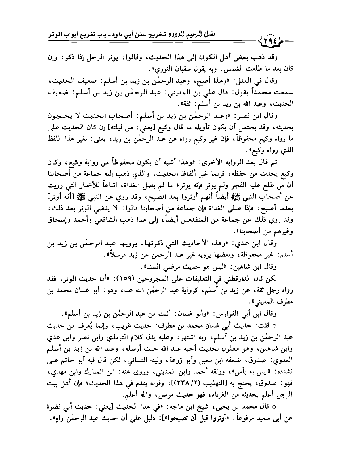 * قال محمد بن يحيى، شيخ ابن ماجه: "في هذا الحديث [يعني: حديث أبي نضرة عن أبي سعيد مرفوعًا: "أوتروا قبل أن تصبحوا"]: دليل على أن حديث عبد الرحمن واهٍ".