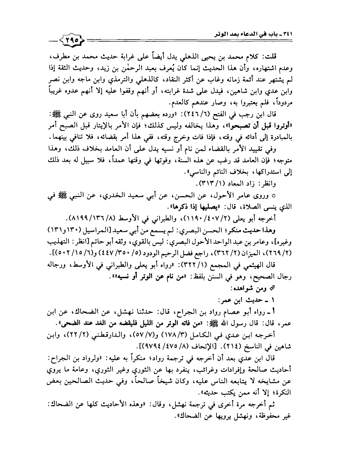 أ- رواه أبو عصام رواد بن الجراح، قال: حدثنا نهشل، عن الضحاك، عن ابن عمر، قال: قال رسول الله -صلى الله عليه وسلم-: "من فاته الوتر من الليل فليقضه من الغد عند الضحى".