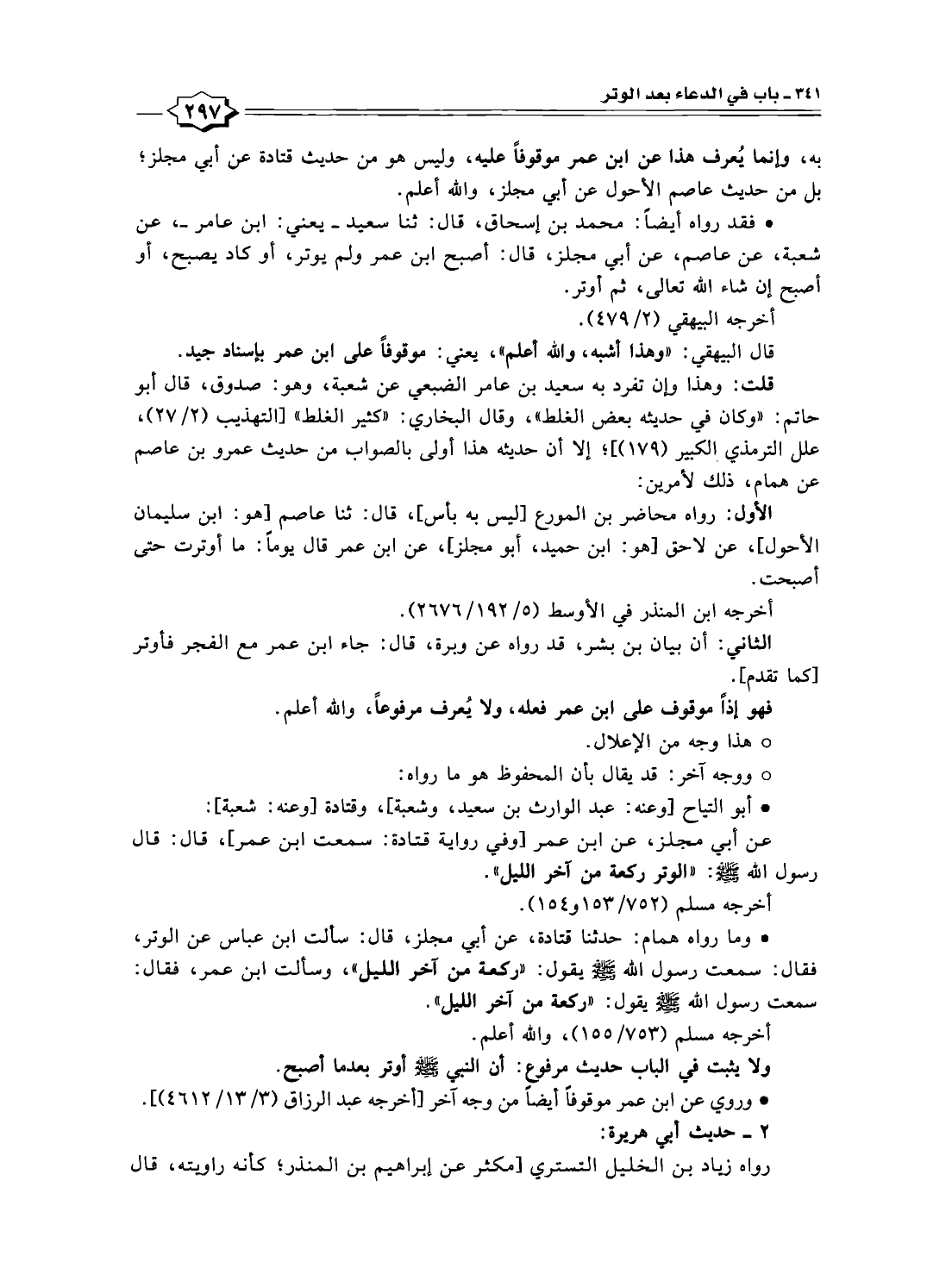 • فقد رواه أيضًا: محمد بن إسحاق، قال: ثنا سعيد -يعني: ابن عامر-، عن شعبة، عن عاصم، عن أبي مجلز، قال: أصبح ابن عمر ولم يوتر، أو كاد يصبح، أو أصبح إن شاء النّه تعالى، ثم أوتر.