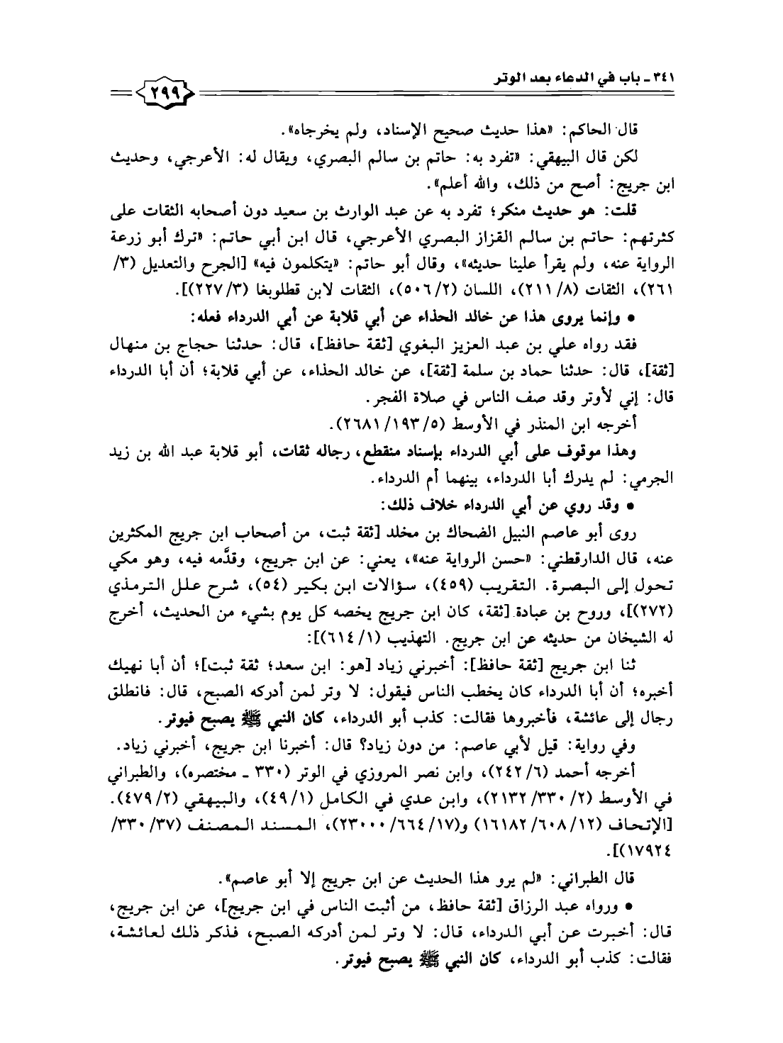 فقد رواه علي بن عبد العزيز البغوي [ثقة حافظ]، قال: حدثنا حجاج بن منهال [ثقة]، قال: حدثنا حماد بن سلمة [ثقة]، عن خالد الحذاء، عن أبي قلابة؛ أن أبا الدرداء قال: إني لأوتر وقد صفط الناس في صلاة الفجر.