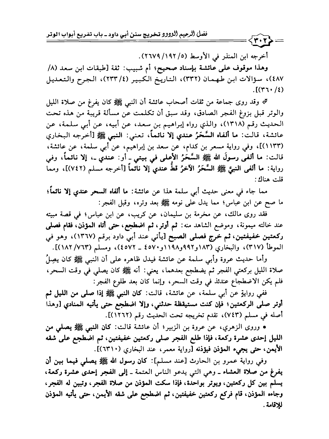 * وقد روى جماعة من ثقات أصحاب عائشة أن النبي -صلى الله عليه وسلم- كان يفرخ من صلاة الليل والوتر قبل بزوغ الفجر الصادق، وقد سبق أن تكلمت عن مسألة قريبة من هذه تحت الحديث رقم (١٣١٨)، والذي رواه إبراهيم بن سعد، عن أبيه، عن أبي سلمة، عن عائشة، قالت: ما ألفاه السَّحَرُ عندي إلا نائمًا، تعني: النبي -صلى الله عليه وسلم-[أخرجه البخاري (١١٣٣)]، وفي رواية مسعر بن كدام، عن سعد بن إبراهيم، عن أبي سلمة، عن عائشة، قالت: ما ألفى رسولَ الله -صلى الله عليه وسلم- السَّحَرُ الأعلى في بيتي -أو: عندي-، إلا نائمًا، وفي رواية: ما ألفى النبيَّ -صلى الله عليه وسلم- السَّحَرُ الآخرُ قطُّ عندي إلا نائمًا [أخرجه مسلم (٧٤٢)]، ومما قلت هناك: