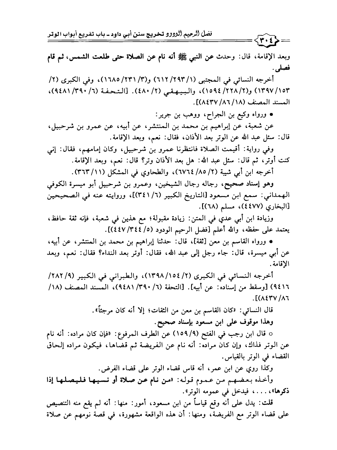 * قال ابن رجب في الفتح (٩/ ١٥٩) عن الطرف المرفوع: "فإن كان مراده: أنه نام عن الوتر فذاك، وإن كان مراده: أنه نام عن الفريضة ثم قضاها، فيكون مراده إلحاق القضاء في الوتر بالقياس.