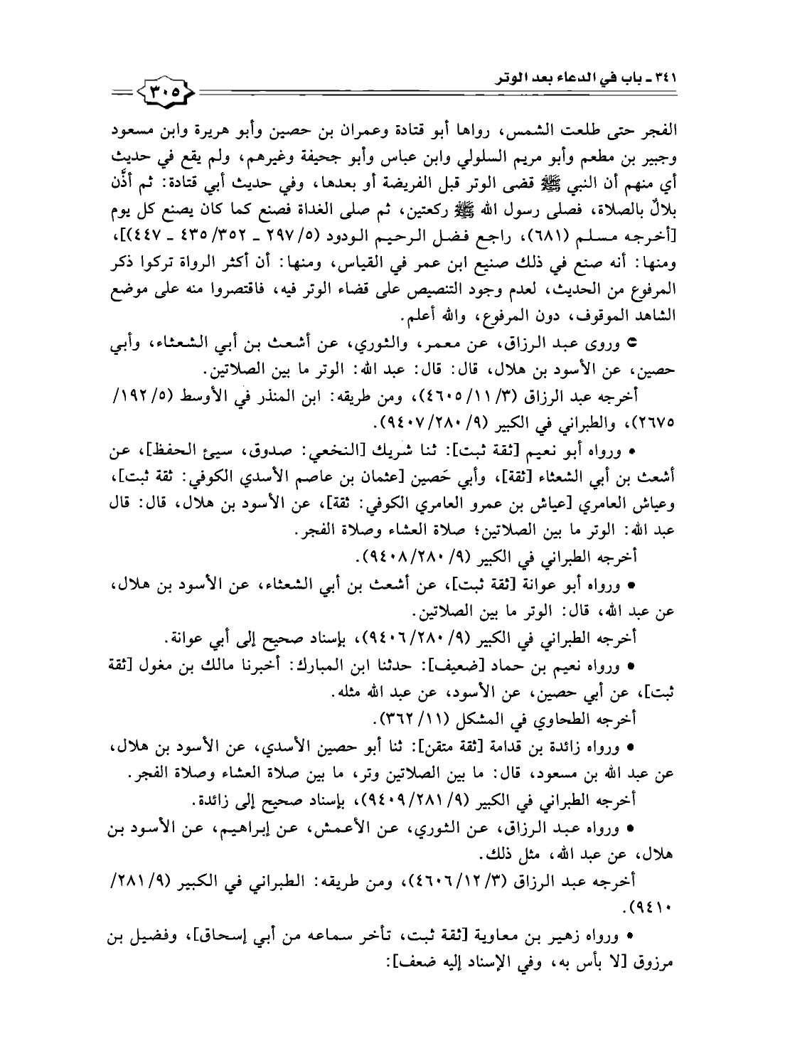 • ورواه أبو نعيم [ثقة ثبت]: ثنا شريك [النخعي: صدوق، سيئ الحفظ]، عن أشعث بن أبي الشعثاء [ثقة]، وأبي حَصين [عثمان بن عاصم الأسدي الكوفي: ثقة ثبت]، وعياش العامري [عياش بن عمرو العامري الكوفي: ثقة]، عن الأسود بن هلال، قال: قال عبد الله: الوتر ما بين الصلاتين؛ صلاة العشاء وصلاة الفجر.