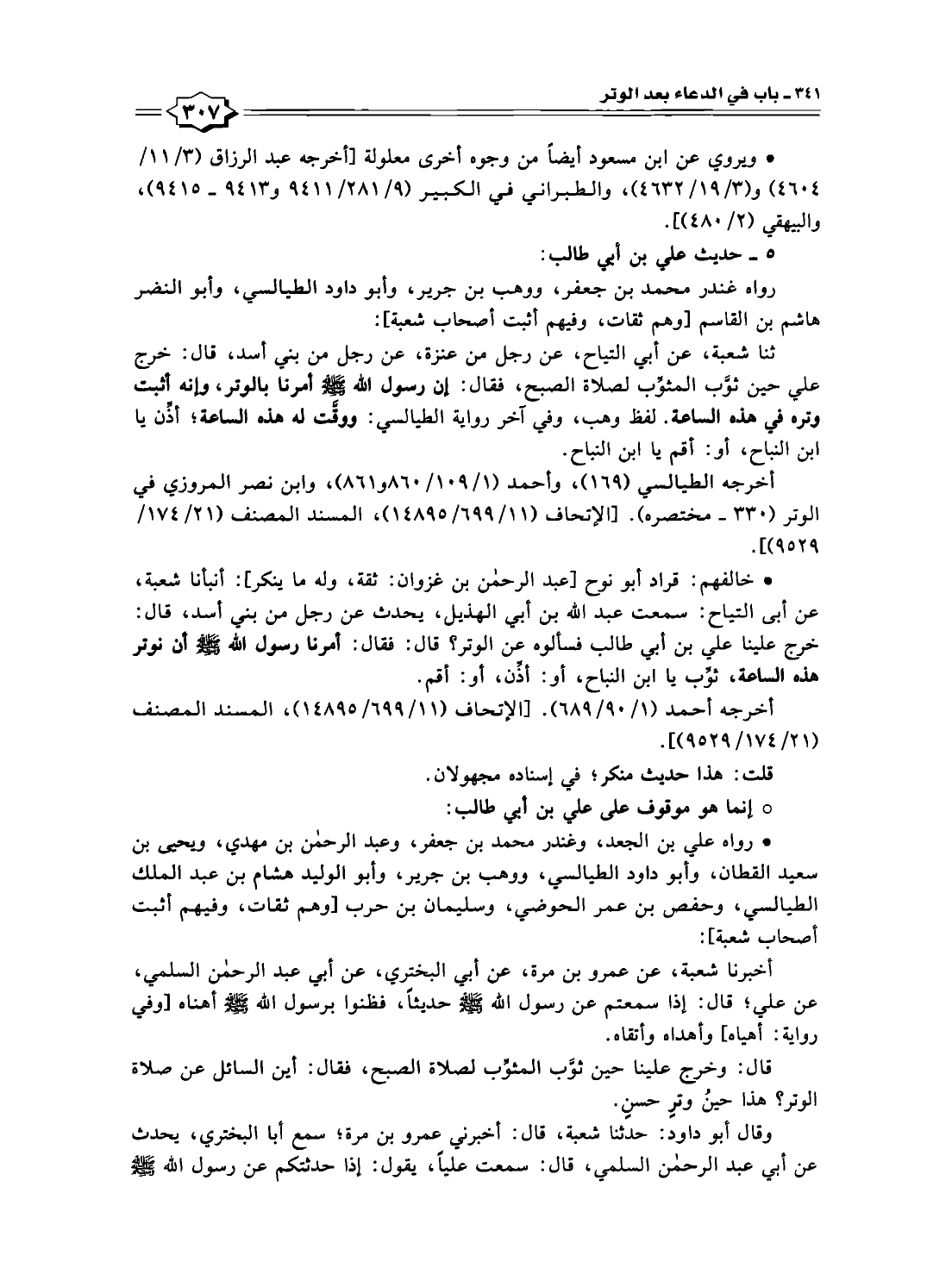 • خالفهم: قراد أبو نوح [عبد الرحمن بن غزوان: ثقة، وله ما ينكر]: أنبأنا شعبة، عن أبى التياح: سمعت عبد الله بن أبي الهذيل، يحدث عن رجل من بني أسد، قال: خرج علينا علي بن أبي طالب فسألوه عن الوتر؟ قال: فقال: أمرنا رسول الله -صلى الله عليه وسلم- أن نوتر هذه الساعة، ثوِّب يا ابن النباح، أو: أذِّن، أو: أقم.
