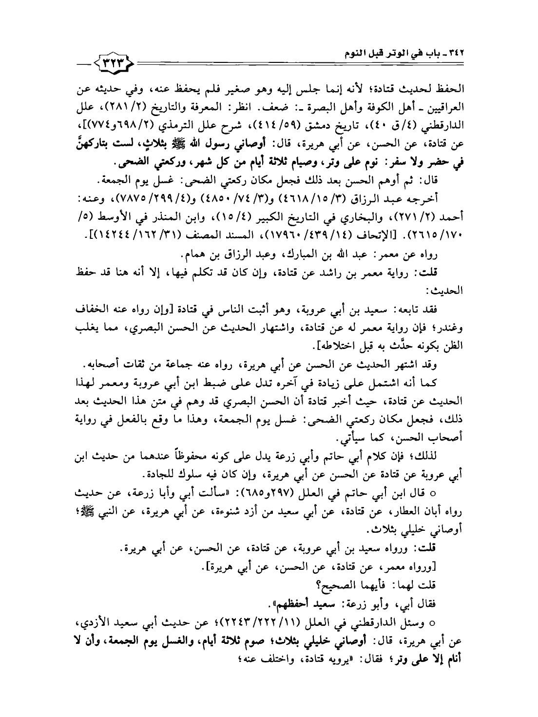 الحفظ لحديث قتادة؛ لأنه إنما جلس إليه وهو صغير فلم يحفظ عنه، وفي حديثه عن العراقيين -أهل الكوفة وأهل البصرة-: ضعف. انظر: المعرفة والتاريخ (٢/ ٢٨١)، علل الدارقطني (٤/ ق ٤٠)، تاريخ دمشق (٥٩/ ٤١٤)، شرح علل الترمذي (٢/ ٦٩٨ و ٧٧٤)]، عن قتادة، عن الحسن، عن أبي هريرة، قال: أوصاني رسول الله -صلى الله عليه وسلم- بثلاثٍ، لست بتاركهنَّ في حضر ولا سفر: نوم على وتر، وصيام ثلاثة أيام من كل شهر، وركعتي الضحى.