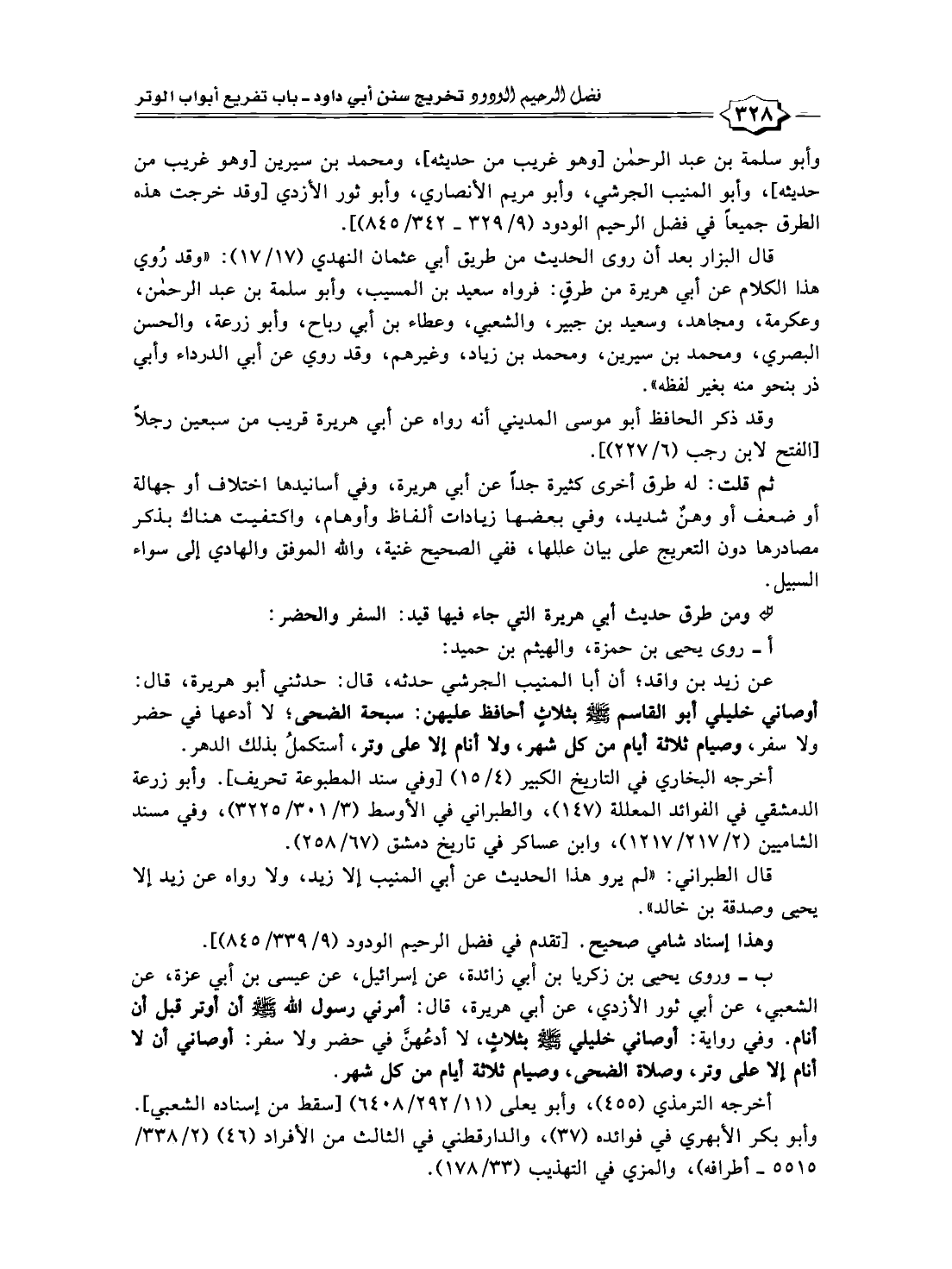 عن زيد بن واقد؛ أن أبا المنيب الجرشي حدثه، قال: حدثني أبو هريرة، قال: أوصاني خليلي أبو القاسم -صلى الله عليه وسلم- بثلاثٍ أحافظ عليهن: سبحة الضحى؛ لا أدعها في حضر ولا سفر، وصيام ثلاثة أيام من كل شهر، ولا أنام إلا على وتر، أستكملُ بذلك الدهر.