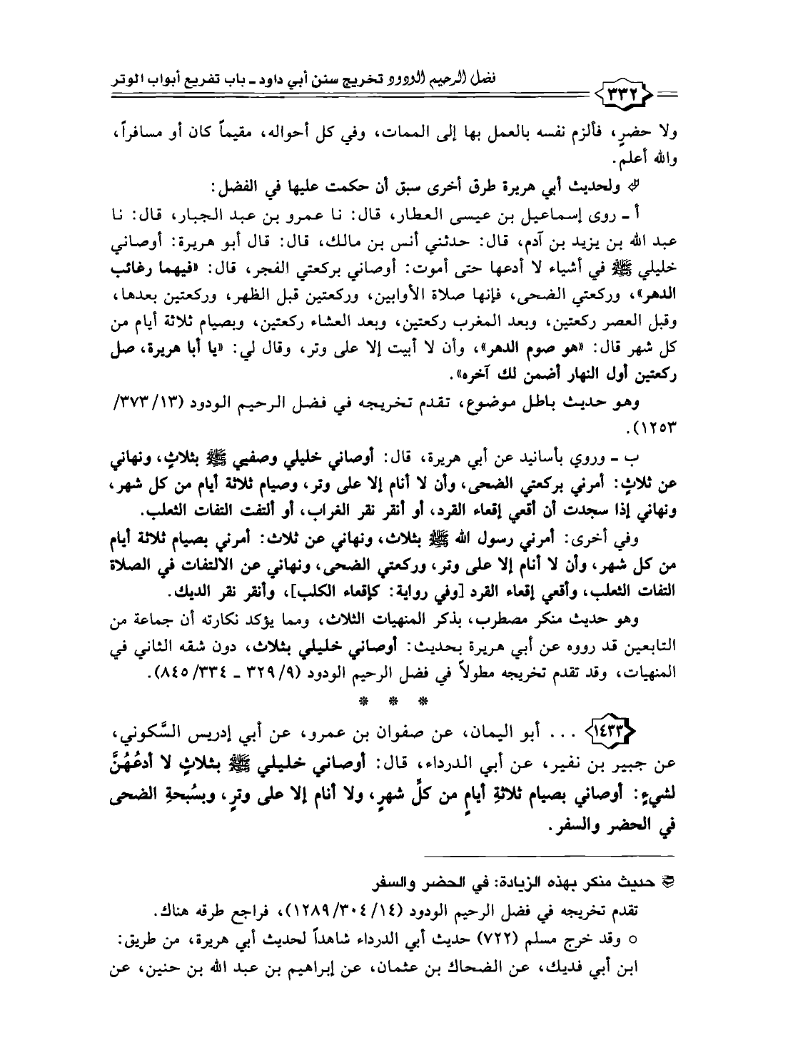 ١٤٣٣ - . . . أبو اليمان، عن صفوان بن عمرو، عن أبي إدريس السَّكوني، عن جبير بن نفير، عن أبي الدرداء، قال: أوصاني خليلي -صلى الله عليه وسلم- بثلاثٍ لا أدعُهُنَّ لشيءٍ: أوصاني بصيام ثلاثةِ أيامٍ من كلِّ شهرٍ، ولا أنام إلا على وترٍ، وبسُبحةِ الضحى في الحضر والسفر.
