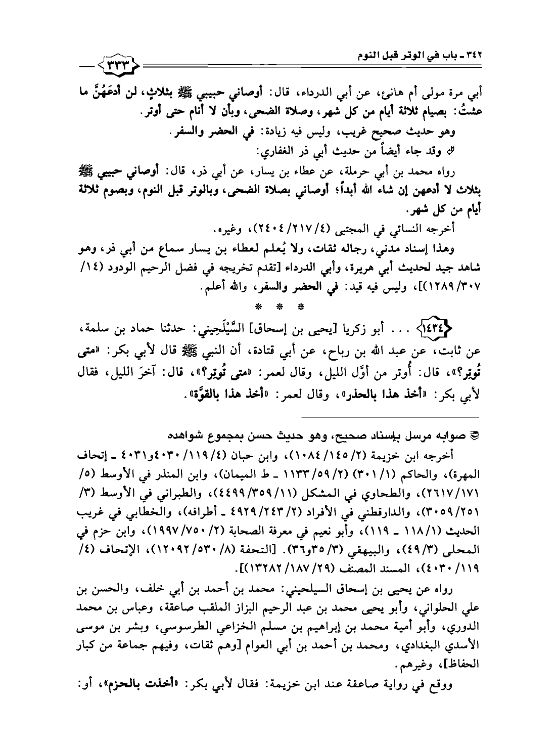 ١٤٣٤ - . . . أبو زكريا [يحيى بن إسحاق] السَّيْلَحِيني: حدثنا حماد بن سلمة، عن ثابت، عن عبد الله بن رباح، عن أبي قتادة، أن النبي -صلى الله عليه وسلم- قال لأبي بكر: "متى تُوتِر؟ "، قال: أُوتر من أوَّل الليل، وقال لعمر: "متى تُوتِر؟ "، قال: آخرَ الليل، فقال لأبي بكر: "أخذ هذا بالحذر"، وقال لعمر: "أخذ هذا بالقوَّة".