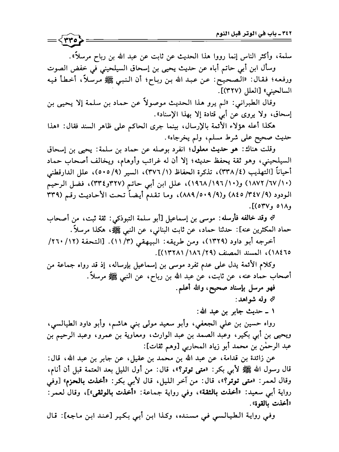 وكلام الأئمة يدل على عدم تفرد موسى بن إسماعيل بإرساله، إذ قد رواه جماعة من أصحاب حماد عنه، عن ثابت، عن عبد الله بن رباح، عن النبي -صلى الله عليه وسلم- مرسلًا.