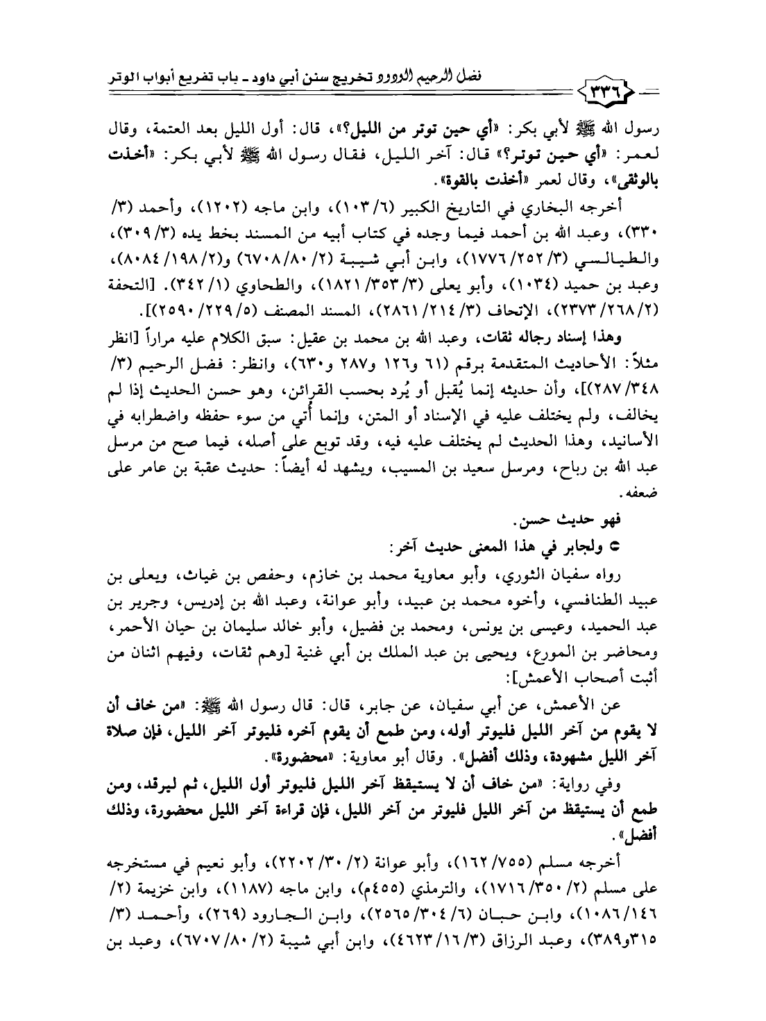 رسول الله -صلى الله عليه وسلم- لأبي بكر: "أي حين توتر من الليل؟ "، قال: أول الليل بعد العتمة، وقال لعمر: "أي حين توتر؟ " قال: آخر الليل، فقال رسول الله -صلى الله عليه وسلم- لأبي بكر: "أخذت بالوثقى"، وقال لعمر "أخذت بالقوة".