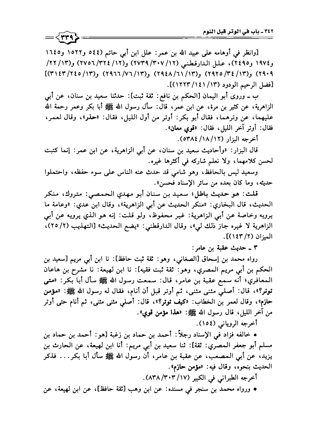 ب- وروى أبو اليمان [الحكم بن نافع: ثقة ثبت]: حدثنا سعيد بن سنان، عن أبي الزاهرية، عن كثير بن مرة، عن ابن عمر، قال: سأل رسول الله -صلى الله عليه وسلم- أبا بكر وعمر رحمة الله عليهما، عن وترهما، فقال أبو بكر: