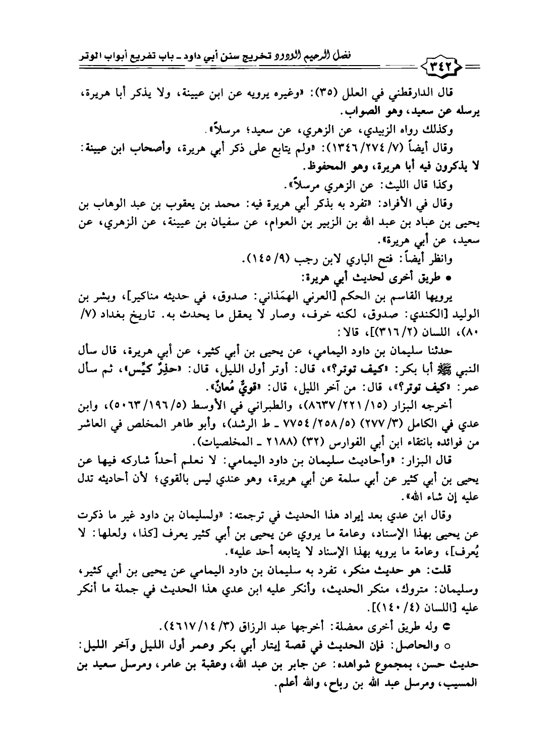 * والحاصل: فإن الحديث في قصة إيتار أبي بكر وعمر أول الليل وآخر الليل: حديث حسن، بمجموع شواهده: عن جابر بن عبد الله، وعقبة بن عامر، ومرسل سعيد بن المسيب، ومرسل عبد الله بن رباح، والله أعلم.