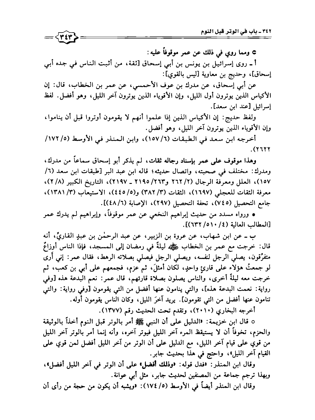 عن أبي إسحاق، عن مدرك بن عوف الأحمسي، عن عمر بن الخطاب، قال: إن الأكياس الذين يوترون أول الليل، وإن الأقوياء الذين يوترون آخر الليل، وهو أفضل. لفظ إسرائيل [عند ابن سعد].