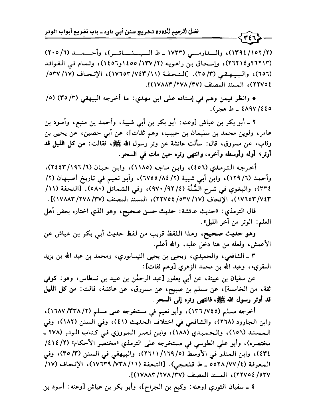 ٢ - أبو بكر بن عياش [وعنه: أبو بكر بن أبي شيبة، وأحمد بن منيع، وأسود بن عامر، ولوين محمد بن سليمان بن حبيب، وهم ثقات]؛ عن أبي حصين، عن يحيى بن وثاب، عن مسروق، قال: سألت عائشة عن وتر رسول الله -صلى الله عليه وسلم-، فقالت: من كل الليل قد أوتر؛ أوله وأوسطه وآخره، وانتهى وتره حين مات في السحر.