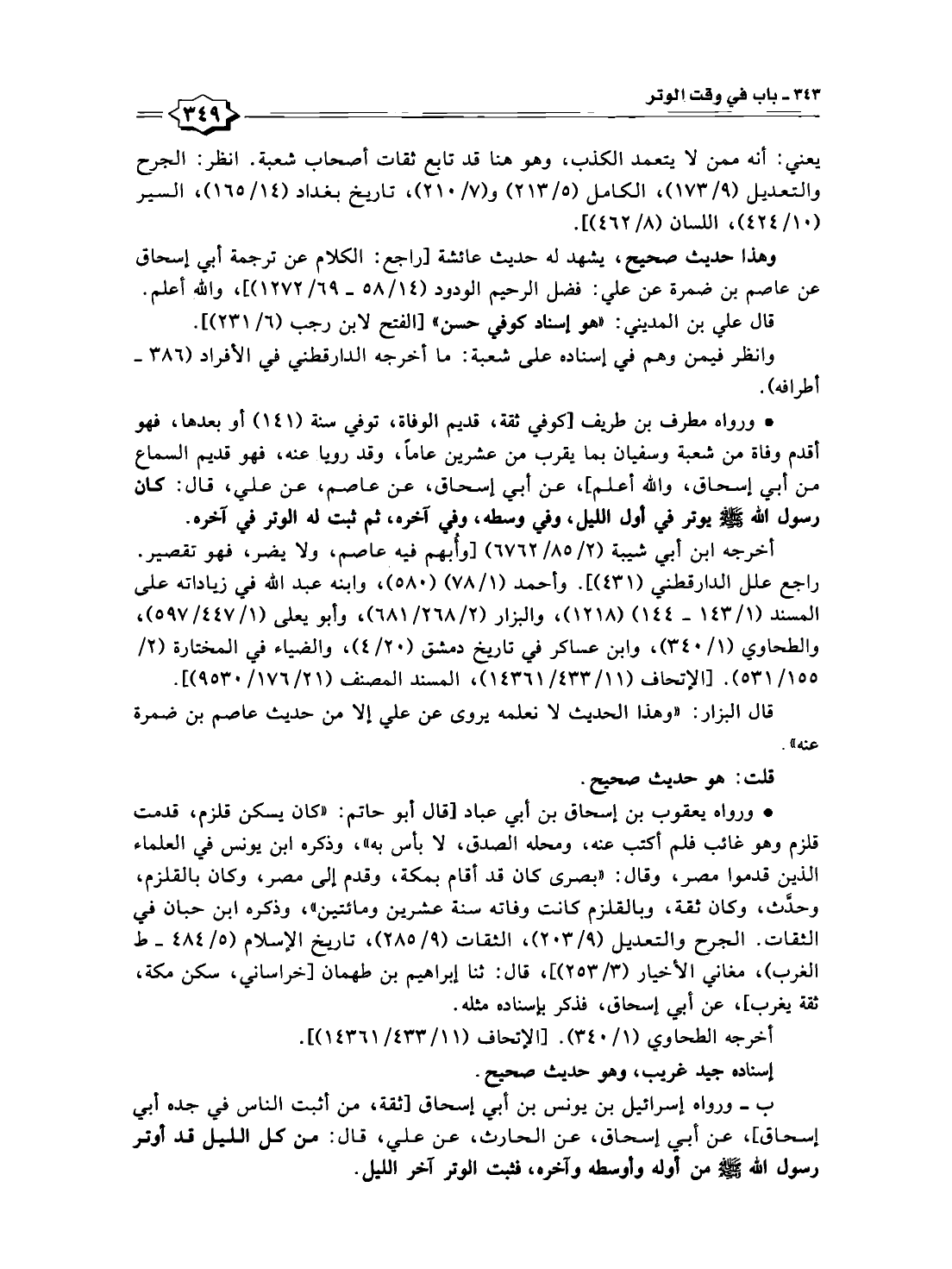 • ورواه مطرف بن طريف [كوفي ثقة، قديم الوفاة، توفي سنة (١٤١) أو بعدها، فهو أقدم وفاة من شعبة وسفيان بما يقرب من عشرين عاماً، وقد رويا عنه، فهو قديم السماع من أبي إسحاق، والله أعلم]؛ عن أبي إسحاق، عن عاصم، عن علي، قال: كان رسول الله -صلى الله عليه وسلم- يوتر في أول الليل، وفي وسطه، وفي آخره، ثم ثبت له الوتر في آخره.