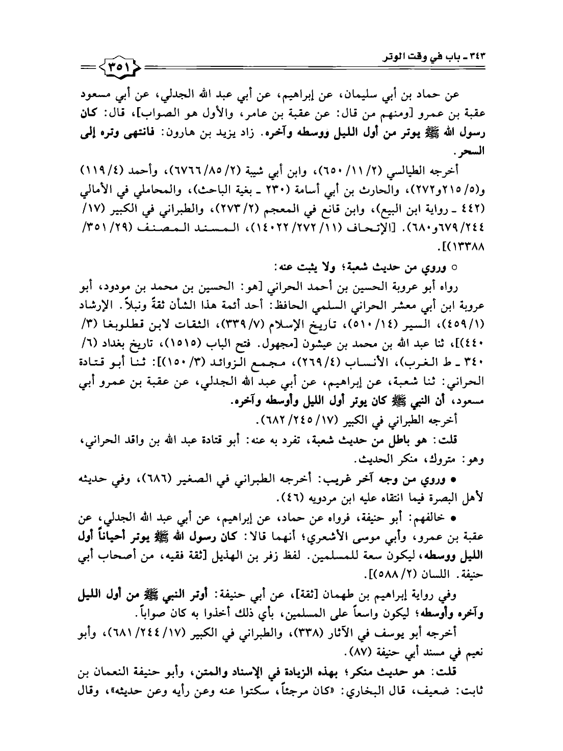 رواه أبو عروبة الحسين بن أحمد الحراني [هو: الحسين بن محمد بن مودود، أبو عروبة ابن أبي معشر الحراني السلمي الحافظ: أحد أئمة هذا الشأن ثقةً ونبلًا. الإرشاد (٩/ ٤٥١)، السير (١٤/ ٥١٠)، تاريخ الإسلام (٧/ ٣٣٩)، الثقات لابن قطلوبغا (٣/ ٤٤٠)]؛ ثنا عبد الله بن محمد بن عيشون [مجهول. فتح الباب (١٥١٥)، تاريخ بغداد (٦/ ٣٤٠ - ط الغرب)، الأنساب (٤/ ٢٦٩)، مجمع الزوائد (٣/ ١٥٠)]: ثنا أبو قتادة الحراني: ثنا شعبة، عن إبراهيم، عن أبي عبد الله الجدلي، عن عقبة بن عمرو أبي مسعود، أن النبي -صلى الله عليه وسلم- كان يوتر أول الليل وأوسطه وآخره.