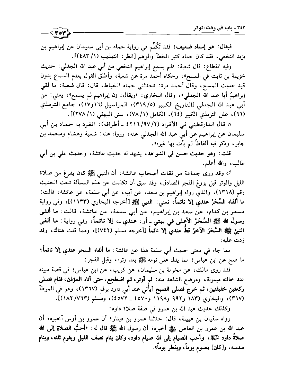 * وقد روى جماعة من ثقات أصحاب عائشة: أن النبي -صلى الله عليه وسلم- كان يفرغ من صلاة الليل والوتر قبل بزوغ الفجر الصادق، وقد سبق أن تكلمت عن هذه المسألة تحت الحديث رقم (١٣١٨)، والذي رواه إبراهيم بن سعد، عن أبيه، عن أبي سلمة، عن عائشة، قالت: ما ألفاه السَّحَرُ عندي إلا نائمًا، تعني: النبي -صلى الله عليه وسلم-[أخرجه البخاري (١١٣٣)]؛ وفي رواية مسعر بن كدام، عن سعد بن إبراهيم، عن أبي سلمة، عن عائشة، قالت: ما ألفى رسولَ الله -صلى الله عليه وسلم- السَّحَرُ الأعلى في بيتي -أو: عندي-، إلا نائمًا، وفي رواية: ما ألفى النبيَّ -صلى الله عليه وسلم- السَّحَرُ الآخرُ قط عندي إلا نائمًا [أخرجه مسلم (٧٤٢)]؛ ومما قلت هناك، وقد زدت عليه: