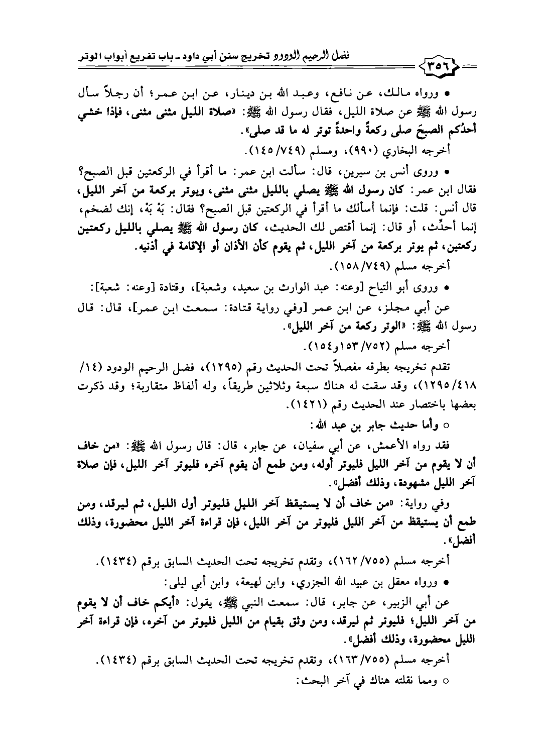 • ورواه مالك، عن نافع، وعبد الله بن دينار، عن ابن عمر؛ أن رجلًا سأل رسول الله -صلى الله عليه وسلم- عن صلاة الليل، فقال رسول الله -صلى الله عليه وسلم-: "صلاة الليل مثنى مثنى، فإذا خشي أحدُكم الصبحَ صلى ركعةً واحدةً توتر له ما قد صلى".