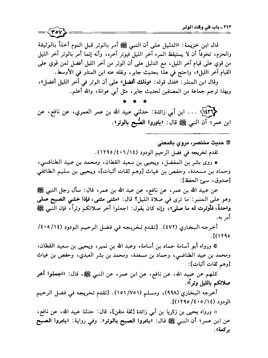 ١٤٣٦ - . . . ابن أبي زائدة: حدثني عبيد الله بن عمر العمري، عن نافع، عن ابن عمر؛ أن النبي -صلى الله عليه وسلم- قال: "بادِروا الصُّبح بالوتر".