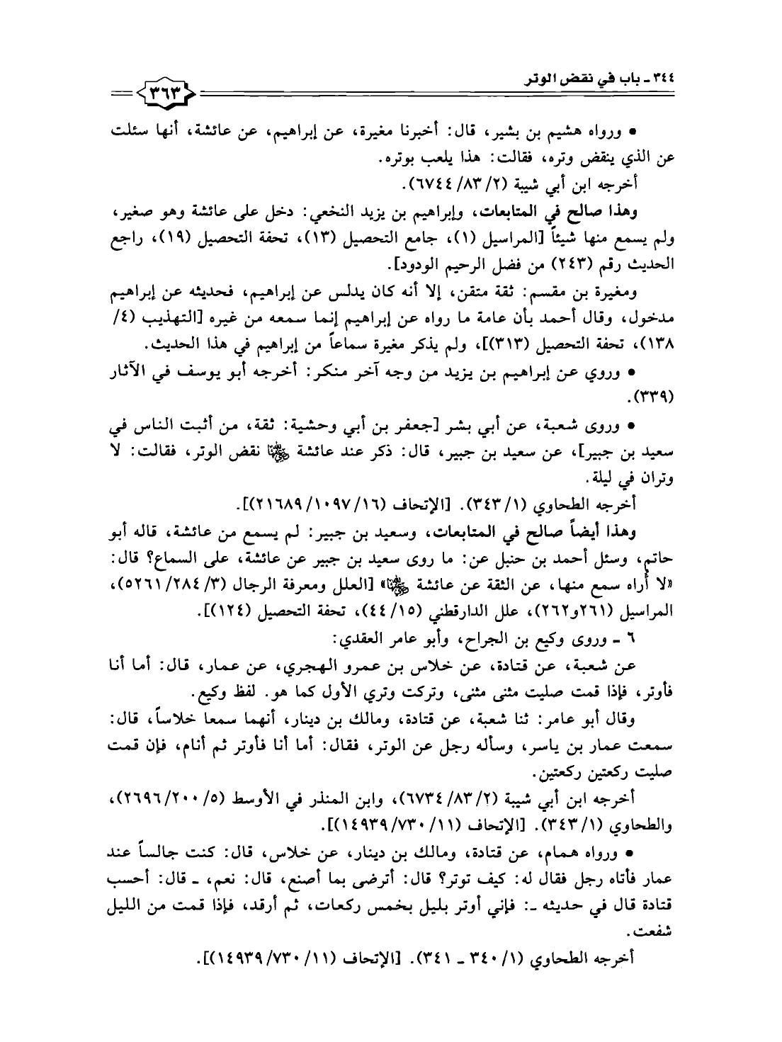 • ورواه هشيم بن بشير، قال: أخبرنا مغيرة، عن إبراهيم، عن عائشة، أنها سئلت عن الذي ينقض وتره، فقالت: هذا يلعب بوتره.