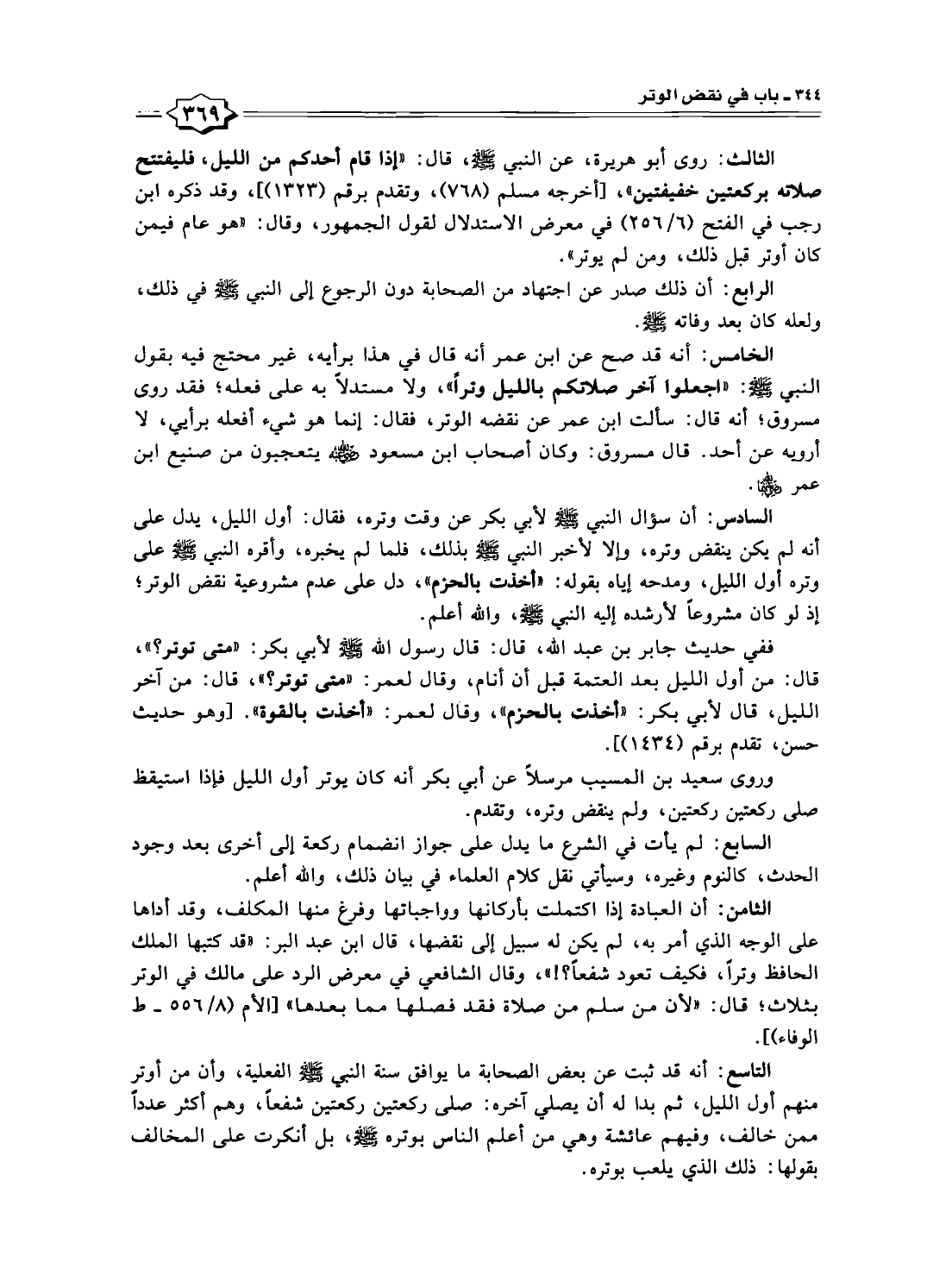 الثالث: روى أبو هريرة، عن النبي -صلى الله عليه وسلم-، قال: "إذا قام أحدكم من الليل، فليفتتح صلاته بركعتين خفيفتين"؛ [أخرجه مسلم (٧٦٨)، وتقدم برقم ١٣٢٣١)]؛ وقد ذكره ابن رجب في الفتح (٦/ ٢٥٦) في معرض الاستدلال لقول الجمهور، وقال: "هو عام فيمن كان أوتر قبل ذلك، ومن لم يوتر".
