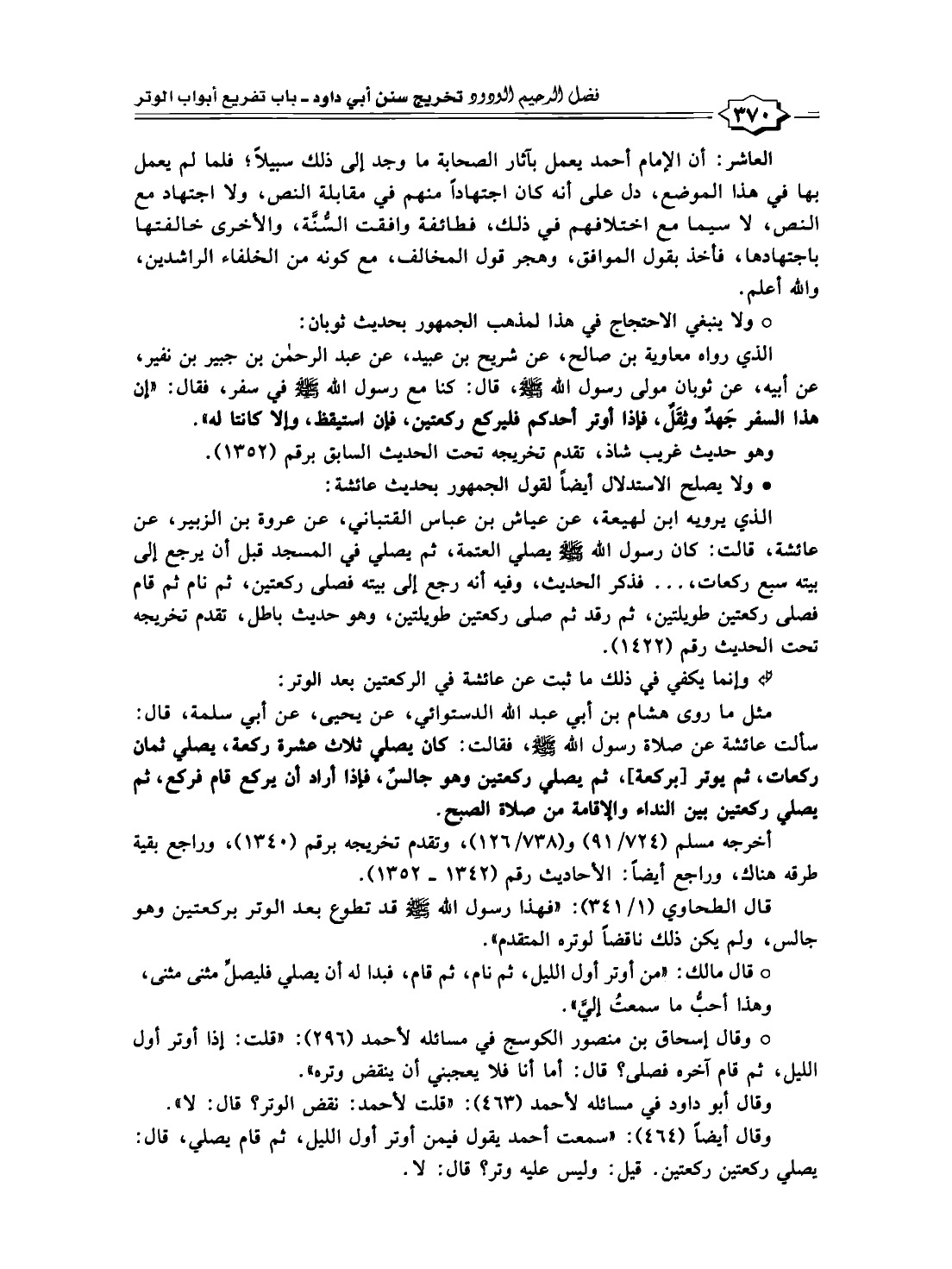 العاشر: أن الأمام أحمد يعمل بآثار الصحابة ما وجد إلى ذلك سبيلًا؛ فلما لم يعمل بها في هذا الموضع، دل على أنه كان اجتهادًا منهم في مقابلة النص، ولا اجتهاد مع النص، لا سيما مع اختلافهم في ذلك، فطائفة وافقت السُّنَّة، والأخرى خالفتها باجتهادها، فأخذ بقول الموافق، وهجر قول المخالف، مع كونه من الخلفاء الراشدين، والله أعلم.