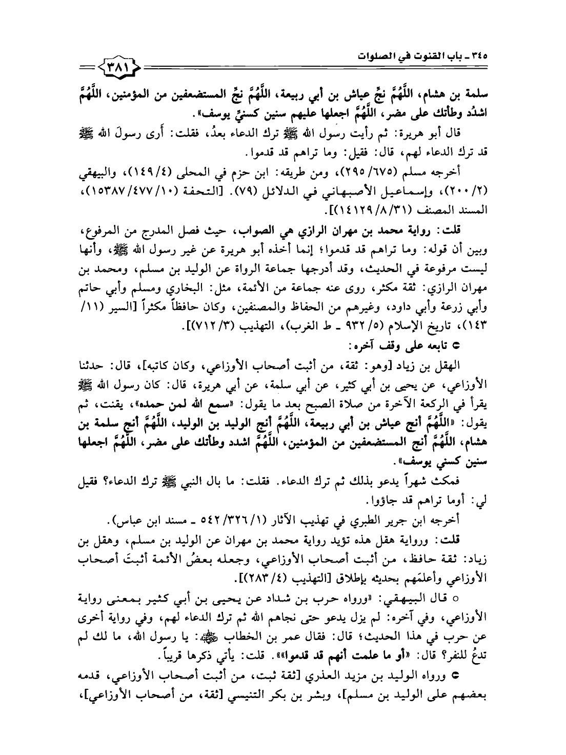 الهقل بن زياد [وهو: ثقة، من أثبت أصحاب الأوزاعي، وكان كاتبه]؛ قال: حدثنا الأوزاعي، عن يحمص بن أبي كثير، عن أبي سلمة، عن أبي هريرة، قال: كان رسول الله -صلى الله عليه وسلم- يقرأ في الركعة الآخرة من صلاة الصبح بعد ما يقول: "سمع الله لمن حمده"، يقنت، ثم يقول: "اللَّهُمَّ أنج عياش بن أبي ربيعة، اللَّهُمَّ أنج الوليد بن الوليد، اللَّهُمَّ أنج سلمة بن هشام، اللَّهُمَّ أنج المستضعفين من المؤمنين، اللَّهُمَّ اشدد وطأتك على مضر، اللَّهُمَّ اجعلها سنين كسني يوسف".