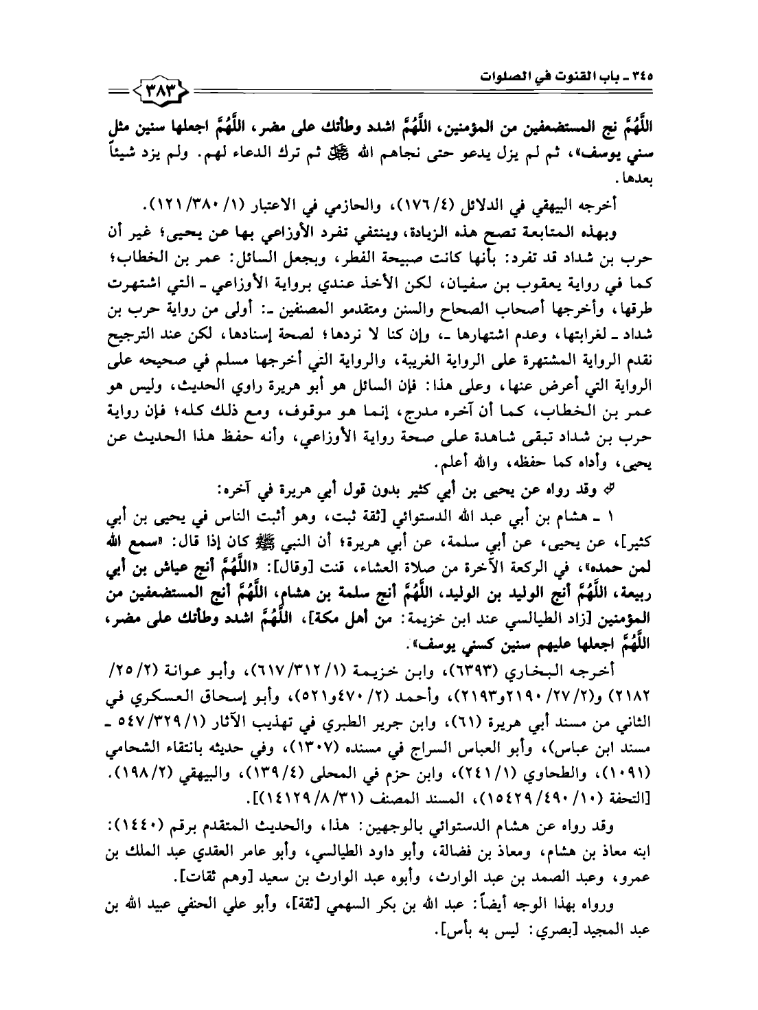 ١ - هشام بن أبي عبد الله الدستوائي [ثقة ثبت، وهو أثبت الناس في يحيى بن أبي كثير]؛ عن يحيى، عن أبي سلمة، عن أبي هريرة؛ أن النبي -صلى الله عليه وسلم- كان إذا قال: "سمع الله لمن حمده "، في الركعة الآخرة من صلاة العشاء، قنت [وقال]: "اللَّهُمَّ أنج عياش بن أبي ربيعة، اللَّهُمَّ أنج الوليد بن الوليد، اللَّهُمَّ أنج سلمة بن هشام، اللَّهُمَّ أنج المستضعفين من المؤمنين [زاد الطيالسي عند ابن خزيمة: من أهل مكة]، اللَّهُمَّ اشدد وطأتك على مضر، اللَّهُمَّ اجعلها عليهم سنين كسني يوسف ".